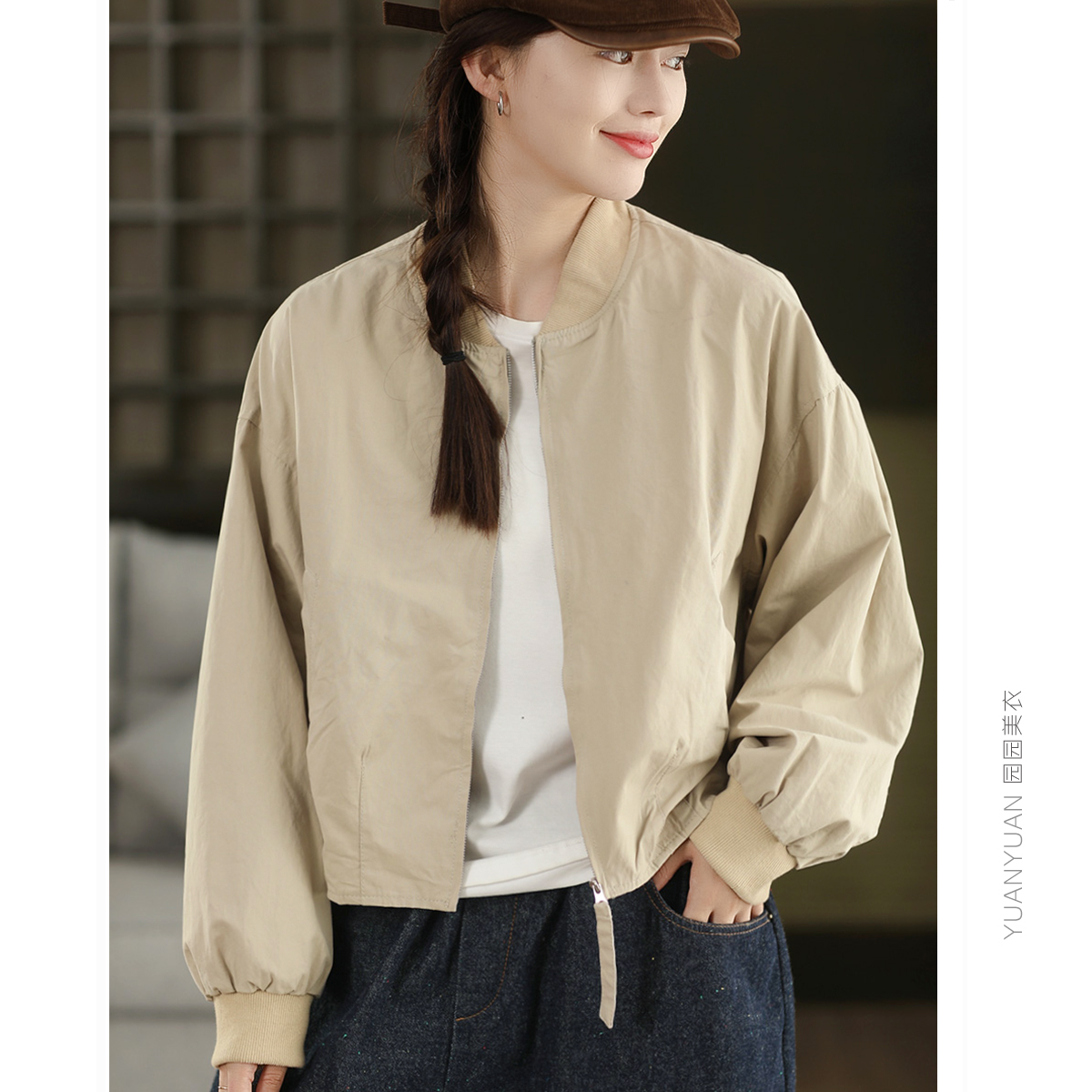 园园美衣秋款复古双层100%棉短外套女螺纹立领棒球服开衫外搭夹克