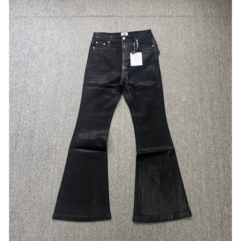 RO原标暗黑风涂层刷腊贴布拼接微喇弹力牛仔裤男女潮高腰修身长裤