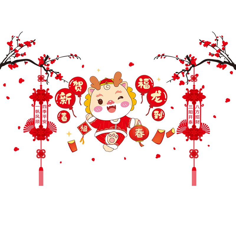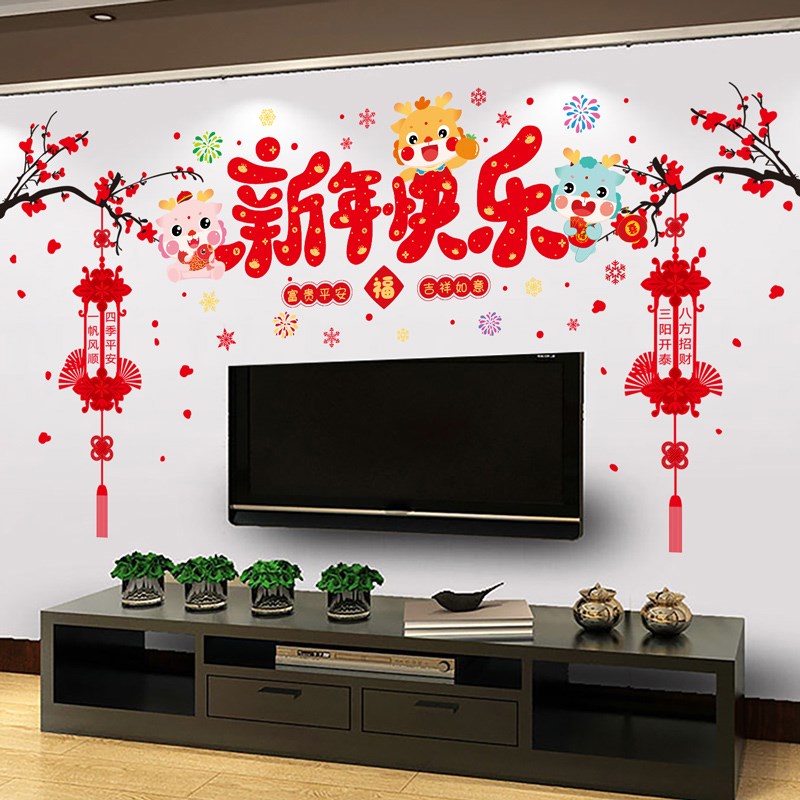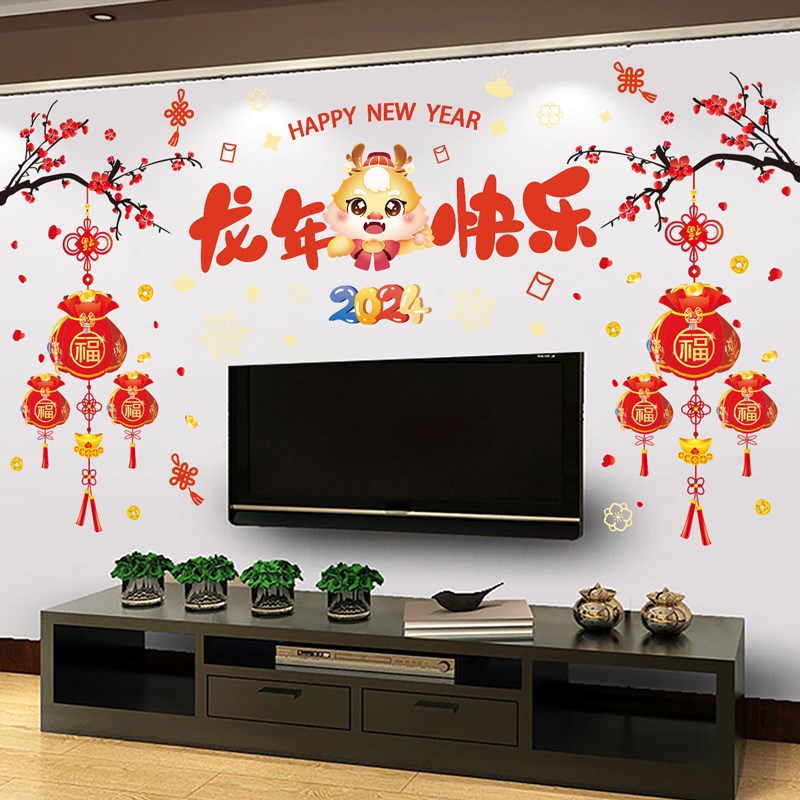 2024新年春节客厅电视背景墙壁纸年画墙贴画龙年过年装饰布置贴纸