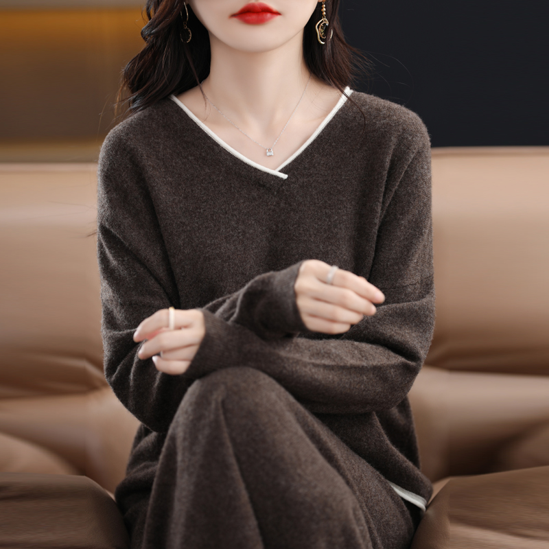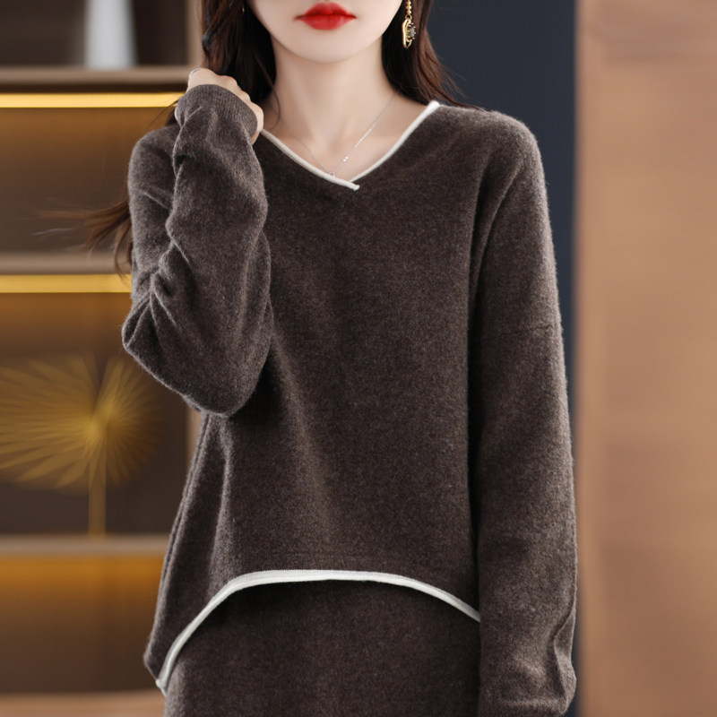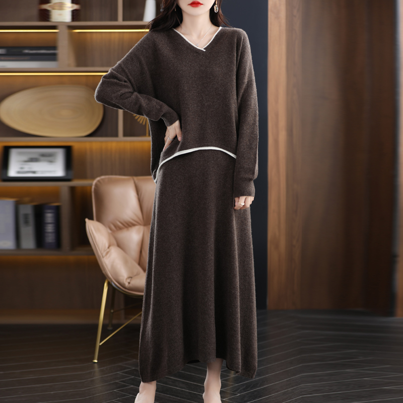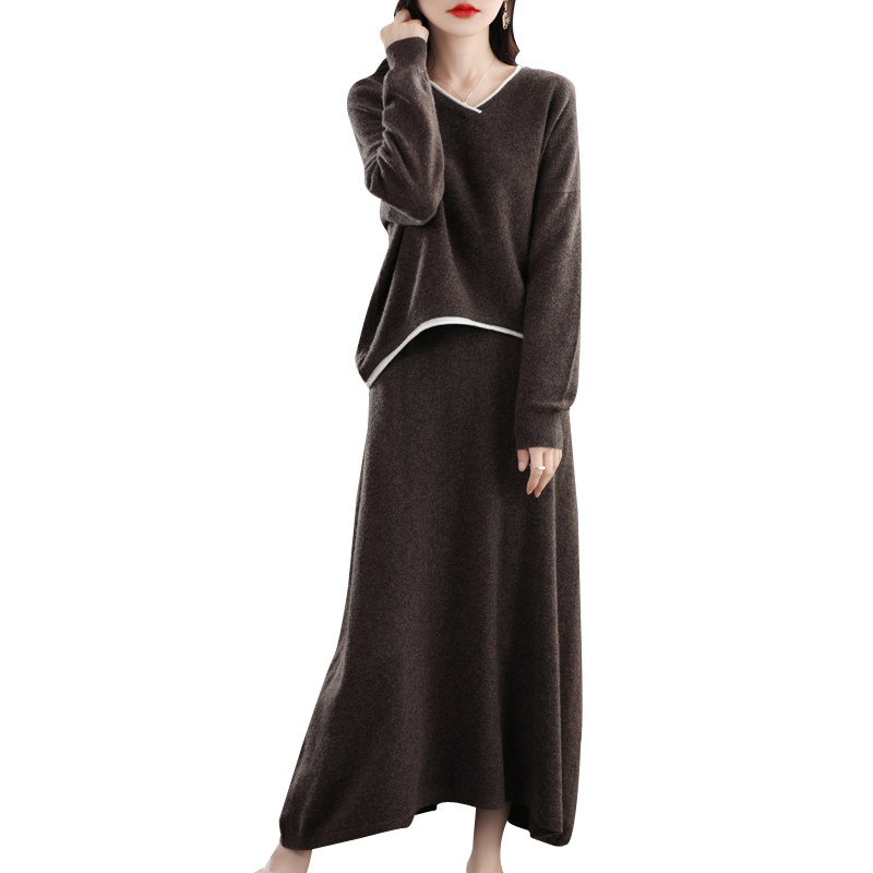 羊毛衫两件套女V领拼色针织套头毛衣裙宽松慵懒羊绒衫套装半身裙
