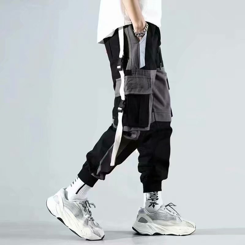 国潮工装裤男夏季薄款九分宽松拼接束脚休闲裤ins潮牌痞帅长裤子