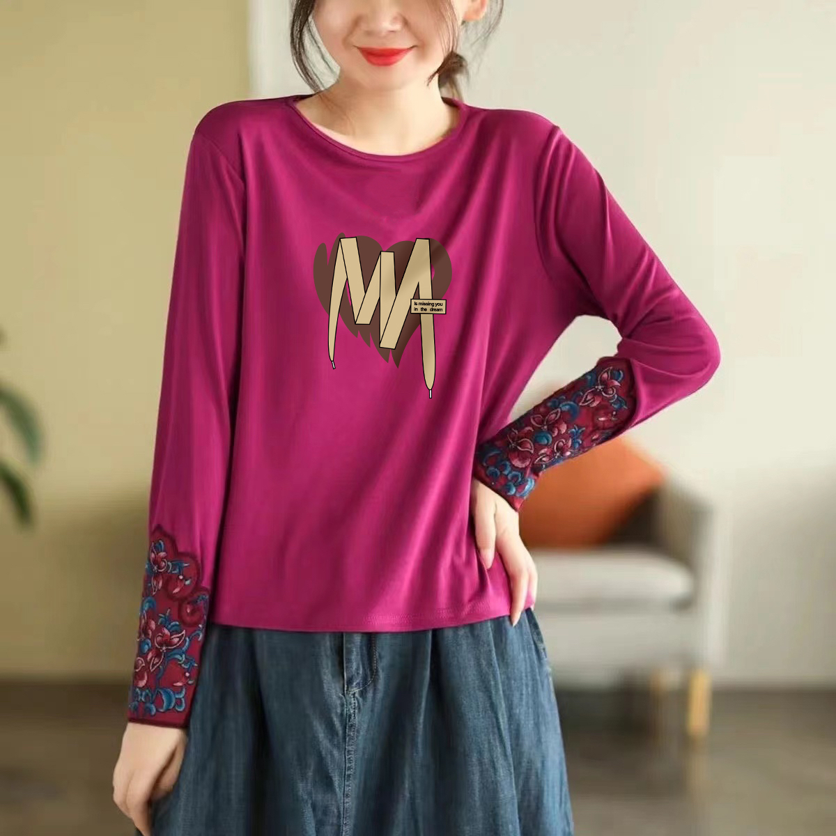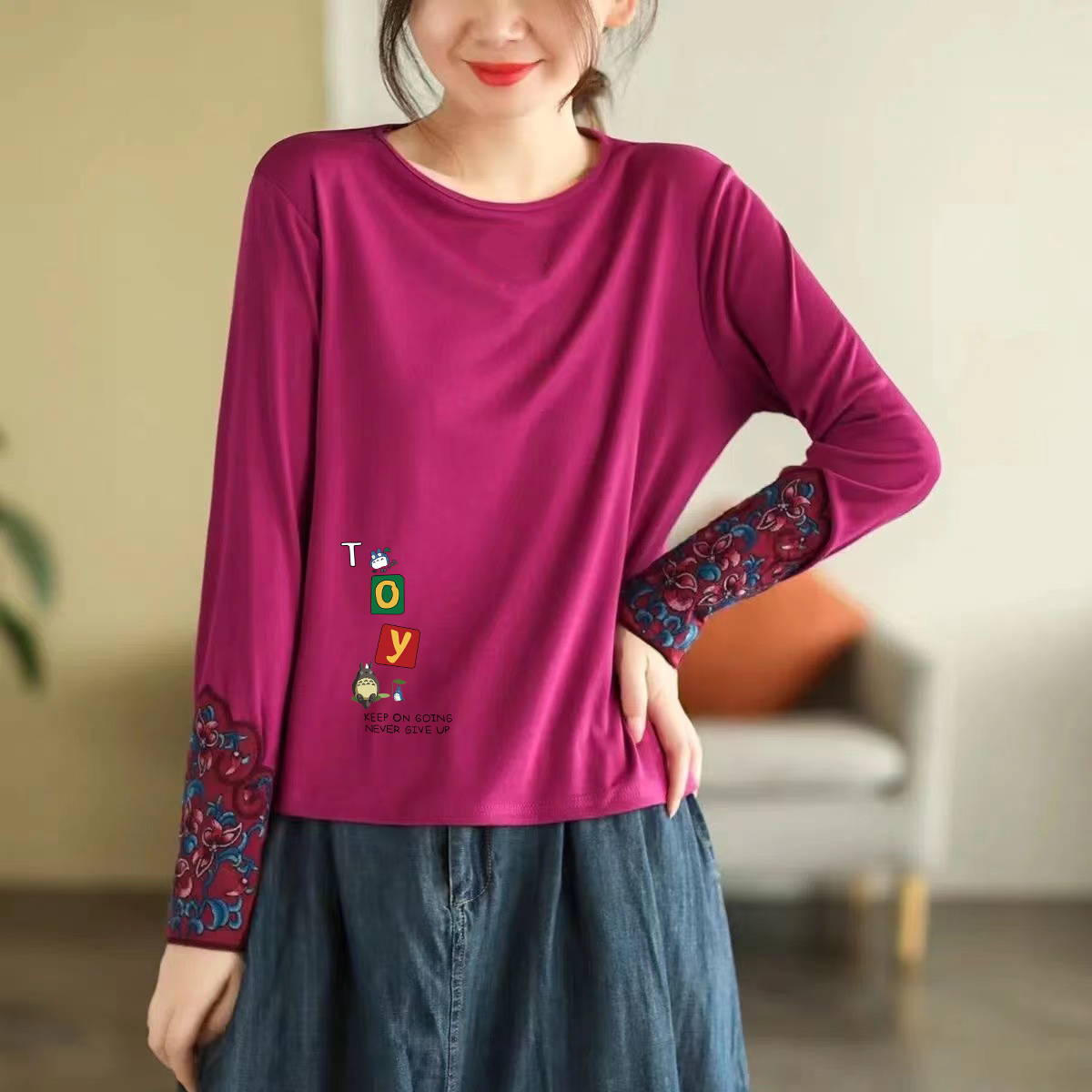 秋季薄款民族风长袖打底衫女纯棉圆领刺绣上衣时尚印花宽松t恤衫