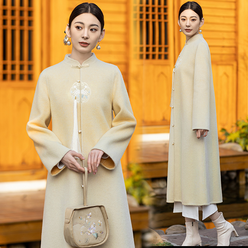 新中式国风双面羊毛外套女长款2025春秋新款复古刺绣禅意呢子大衣