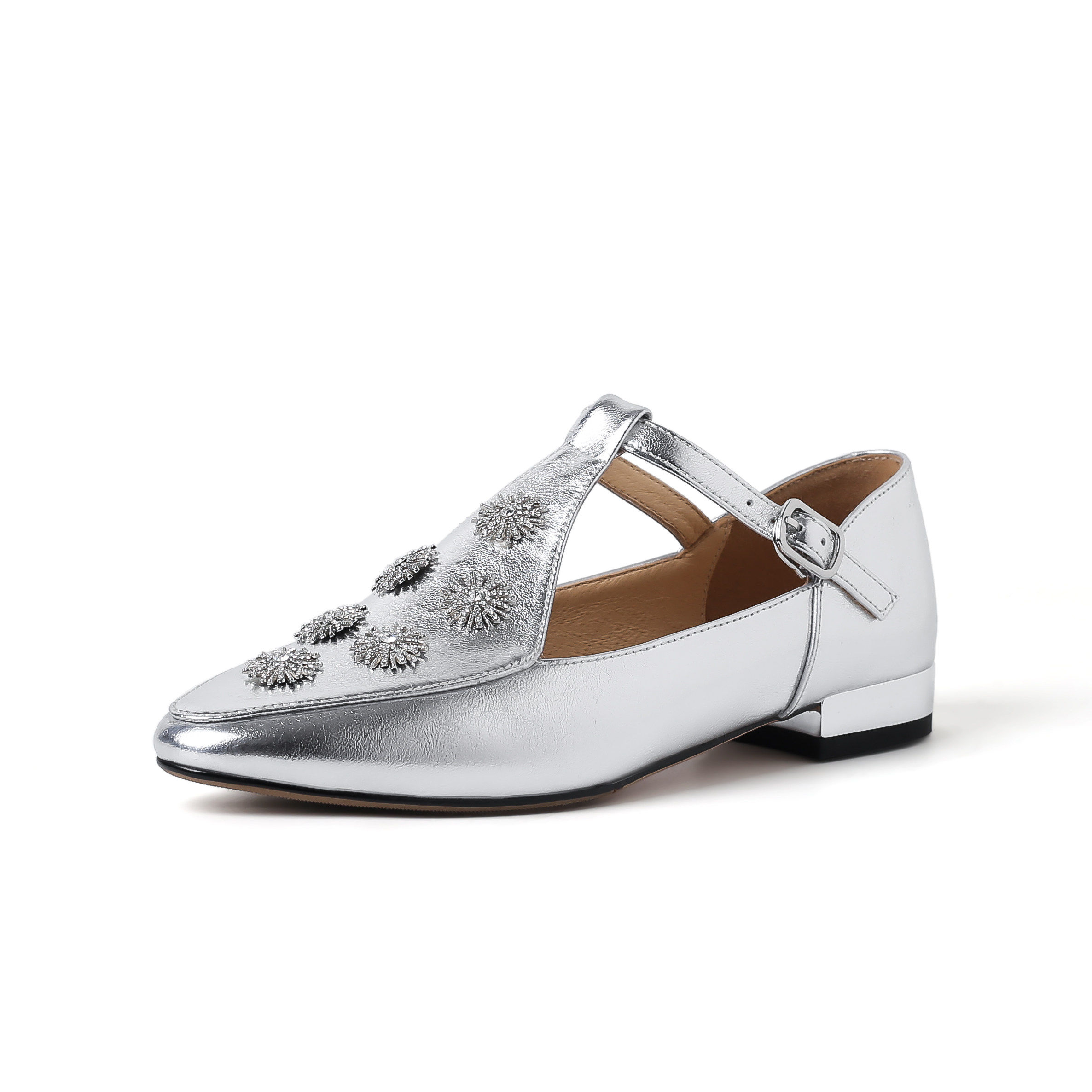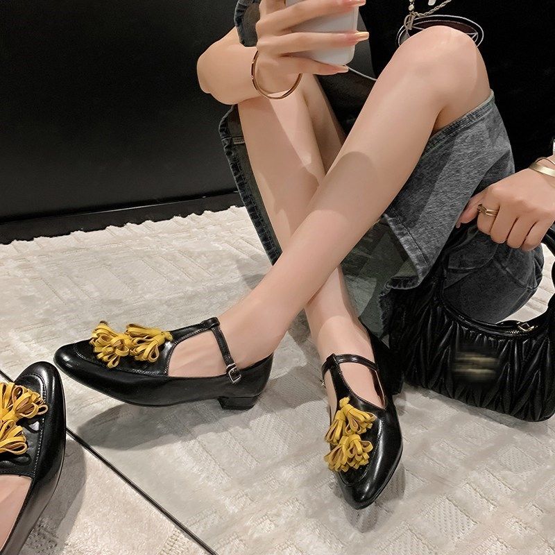 真皮法式少女玛吉珍小皮鞋日系银色尖头平底流苏t字玛丽珍单鞋女