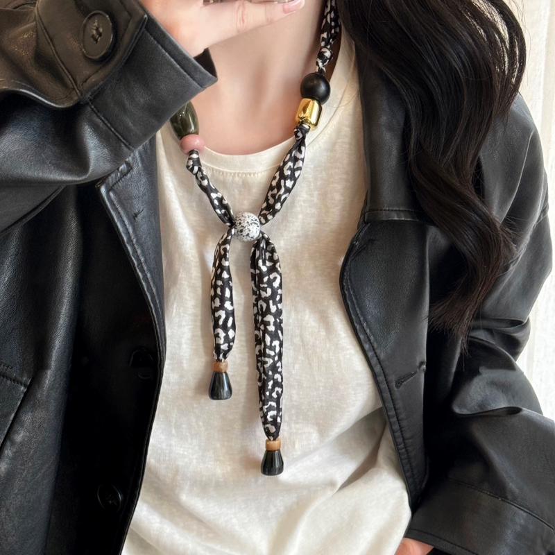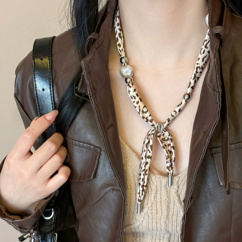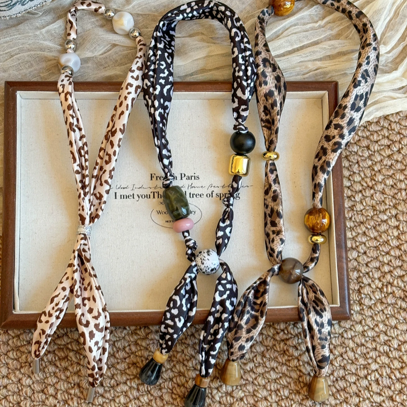 美拉德豹纹丝巾圆珠项链女2025新款复古设计可调节长款毛衣链配饰