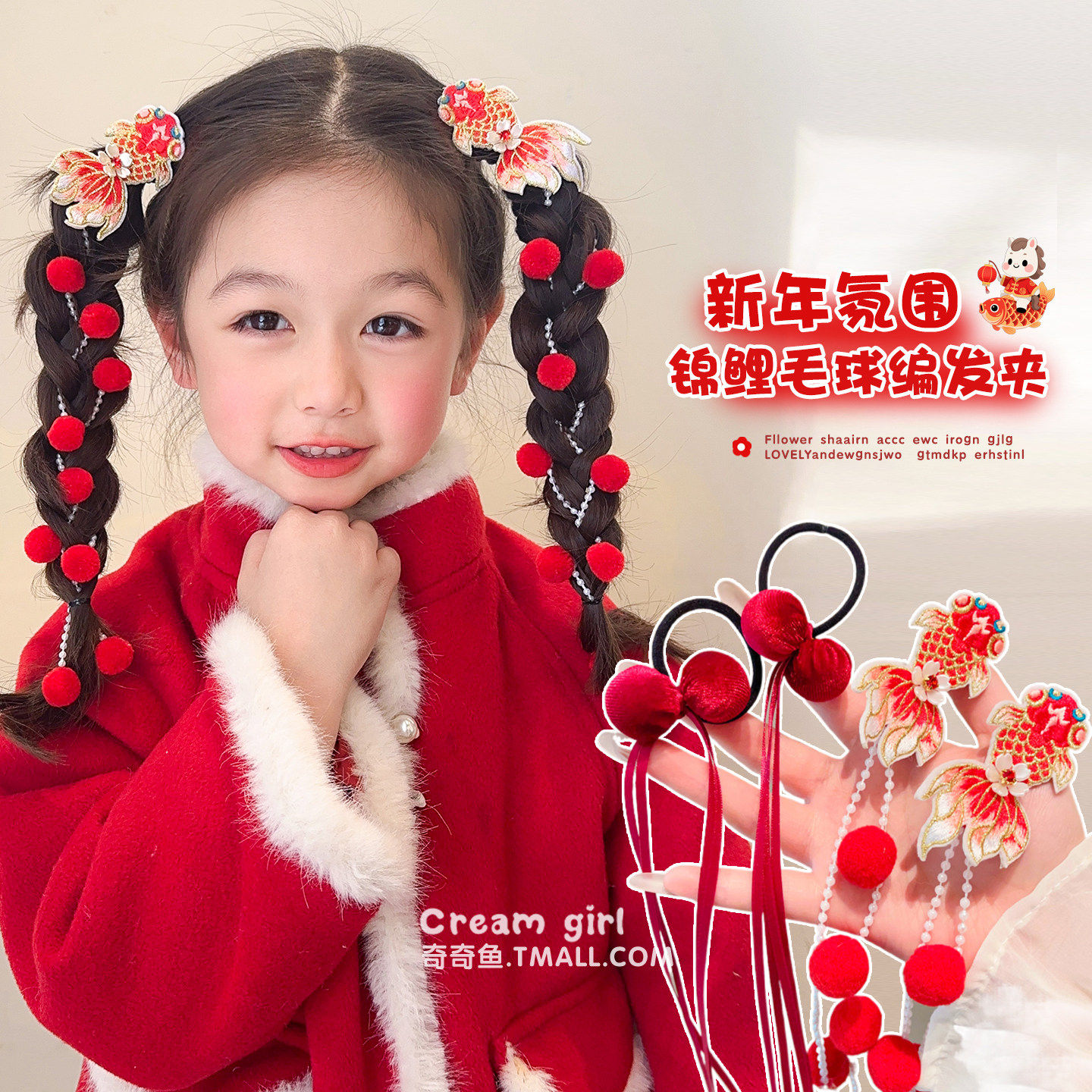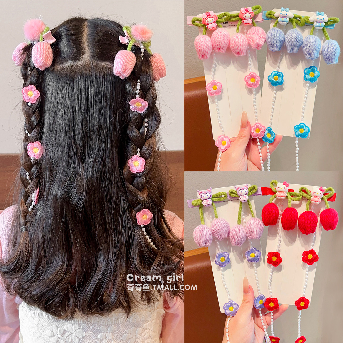 新年儿童卡通针织郁金香花朵编发链珠珠流苏发夹小女孩公主头饰女