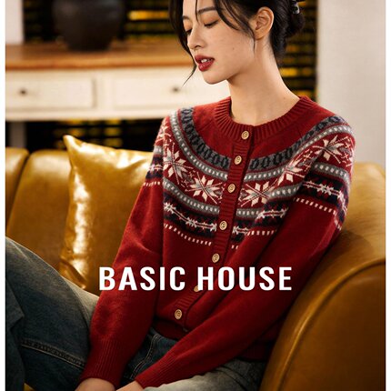 百家好新年红费尔岛针织毛衣女2026春新款复古单排扣宽松圆领开衫