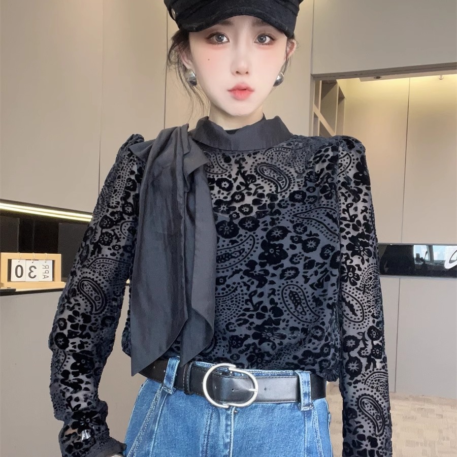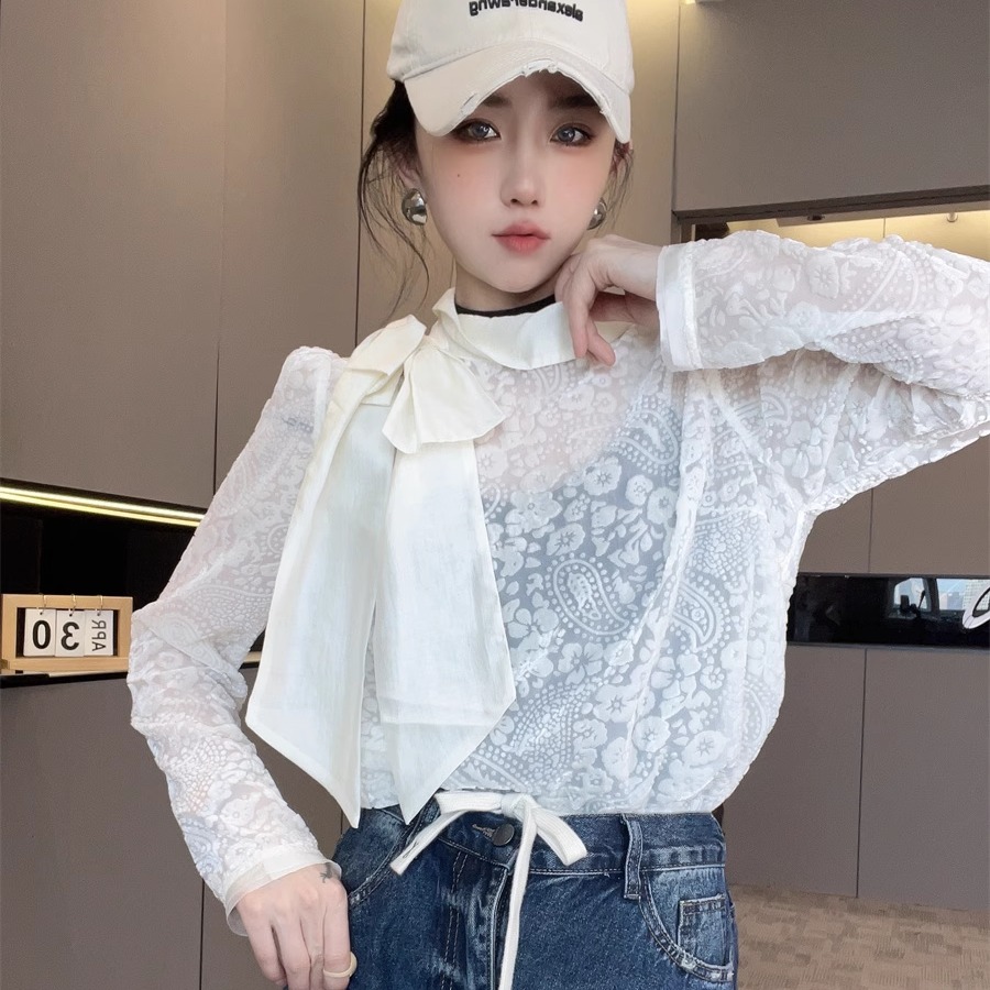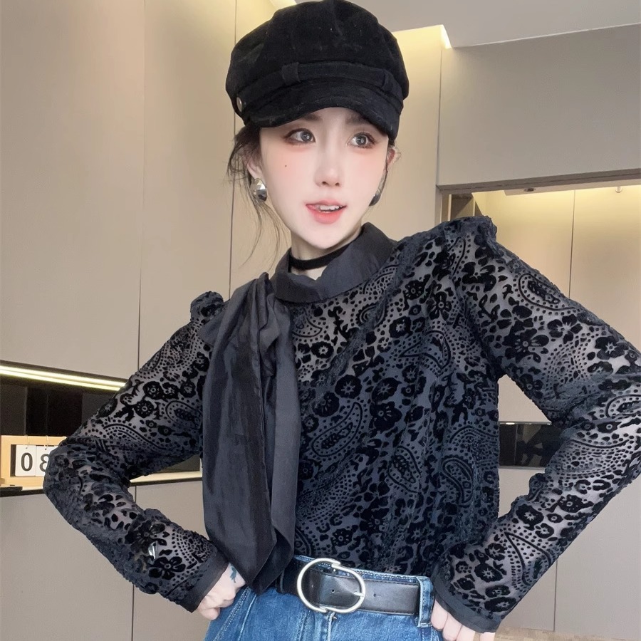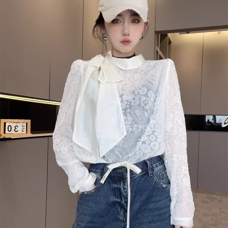 法式小资衬衫女2025新款秋季圆领飘带领结套头衬衣欧货时髦上衣潮