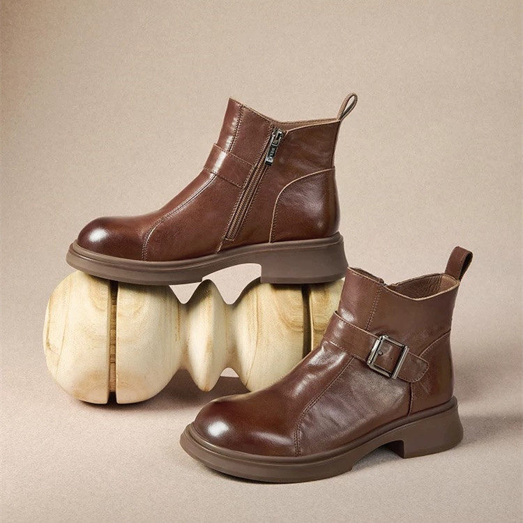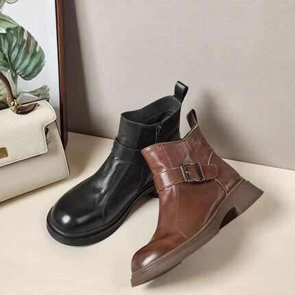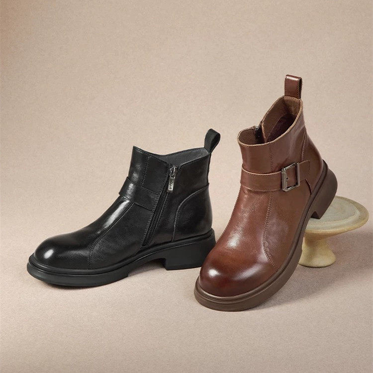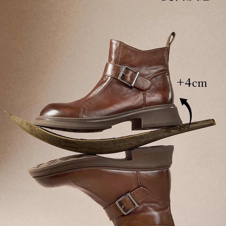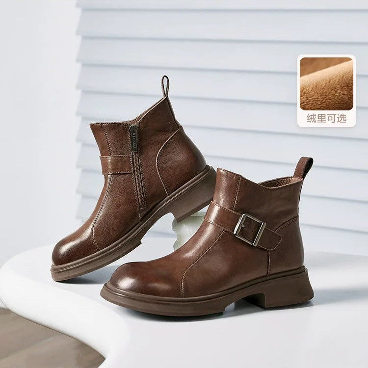 商场同款2025款女鞋黑巧靴抓皱真皮时装靴加绒秋冬新款短筒靴E8P1