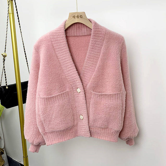 仿水貂绒针织开衫女新款韩版秋冬加厚短款小个子宽松外穿毛衣外套