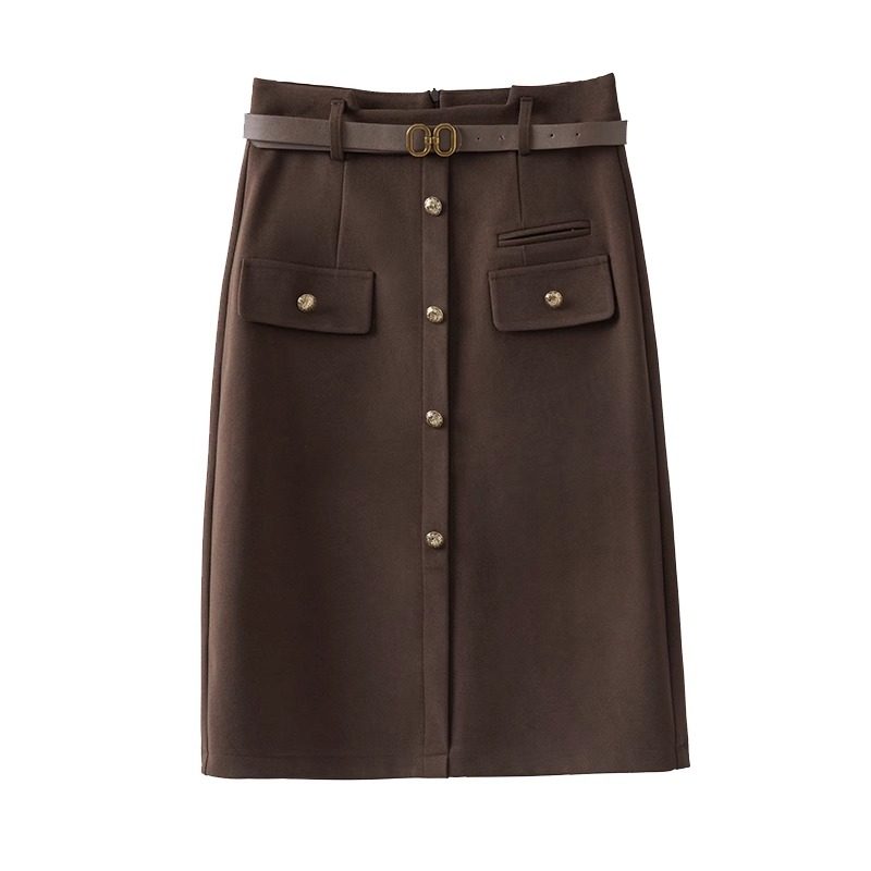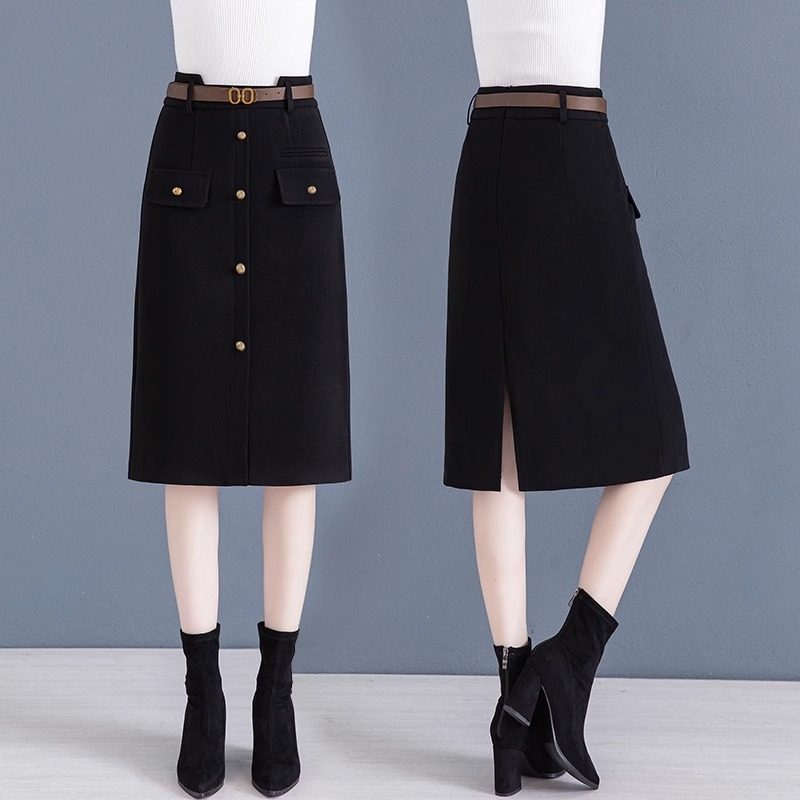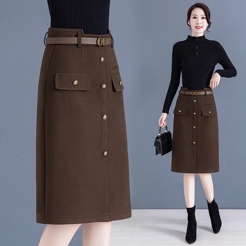 毛呢半身裙女2025年春秋新款高腰中长款a字包臀裙开叉咖色呢子裙