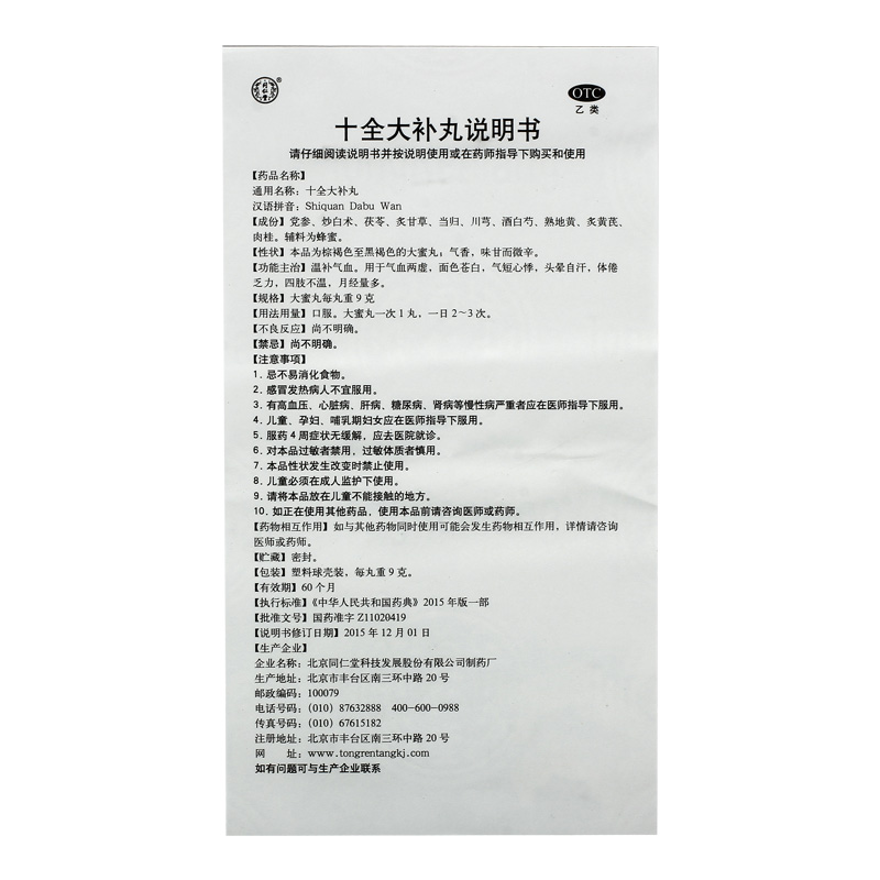 【自营】【同仁堂】十全大补丸9g*10丸/盒气血两虚气短心悸月经量多温补气血补气血