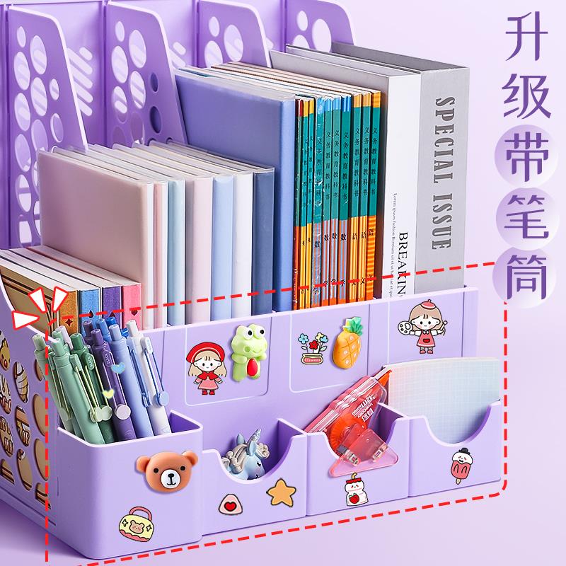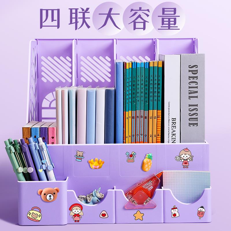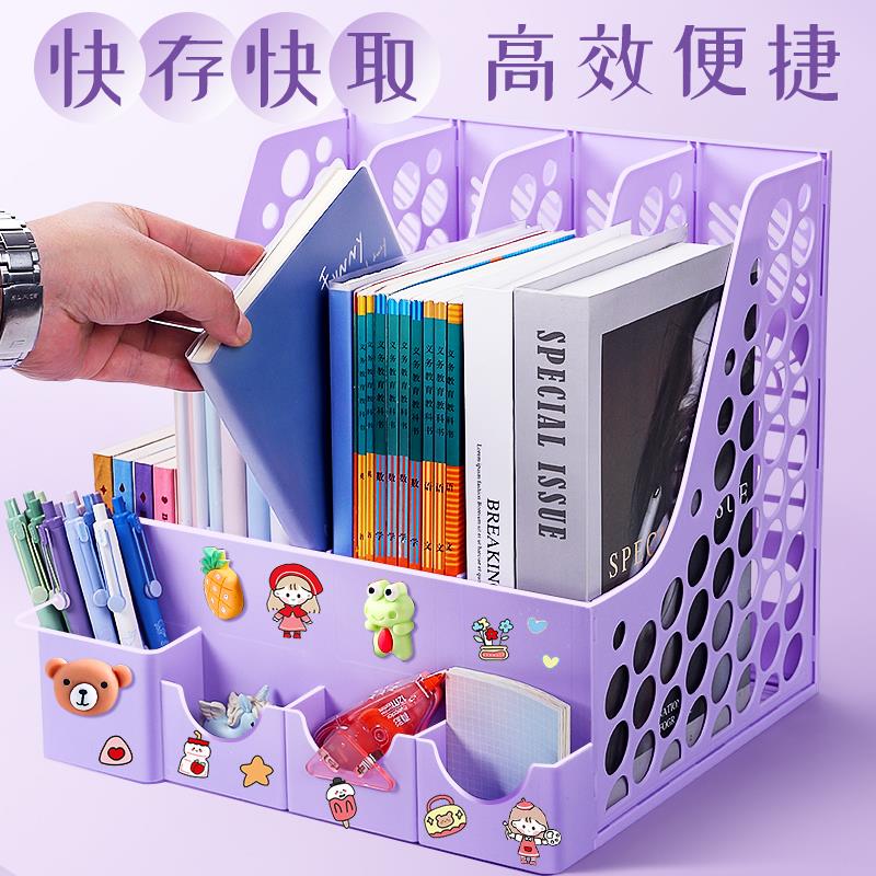 加厚书架桌面书立架儿童学习A4四联可爱文件框多层折叠四栏办公用品塑料资料框办公室桌面收纳档案文件架栏