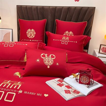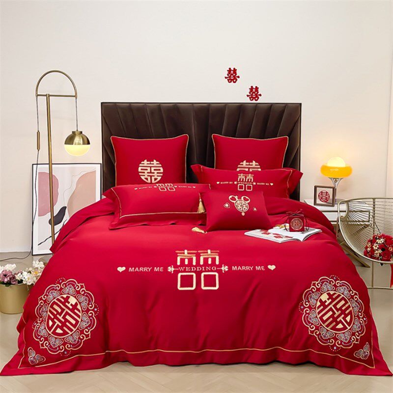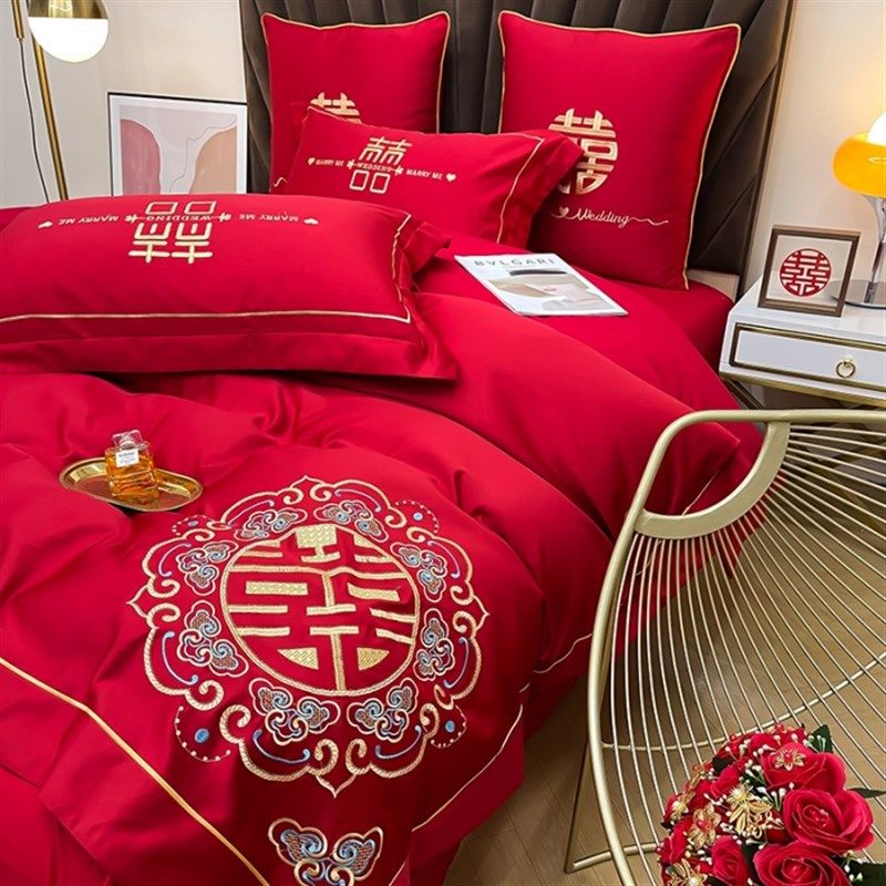 100支长绒棉全棉大红婚庆刺绣结婚喜庆床单被套欧式床品四件套