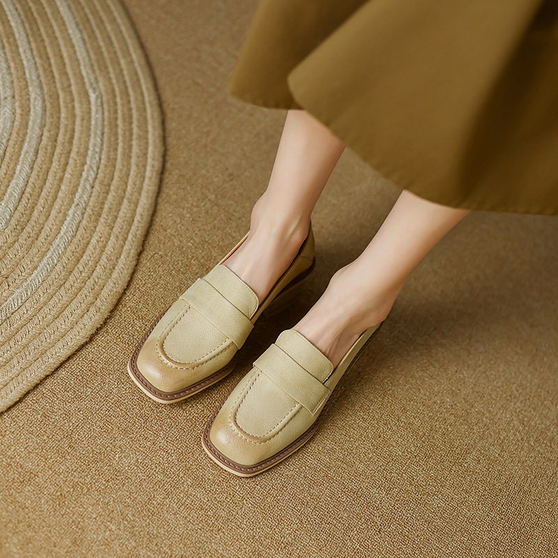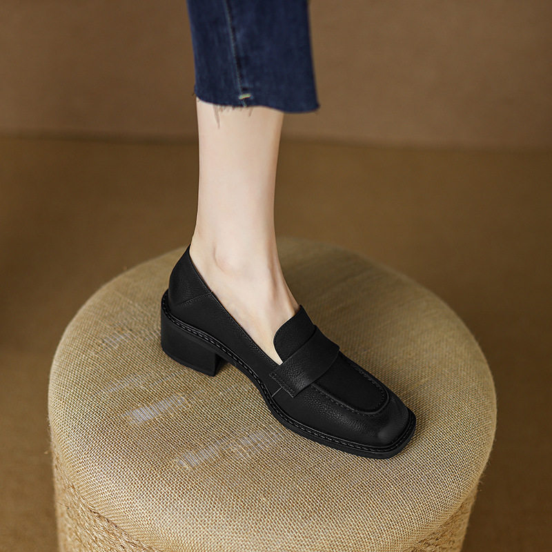 一件代发2023春夏新款时尚百搭粗跟中跟乐福方头单鞋牛皮时装女鞋