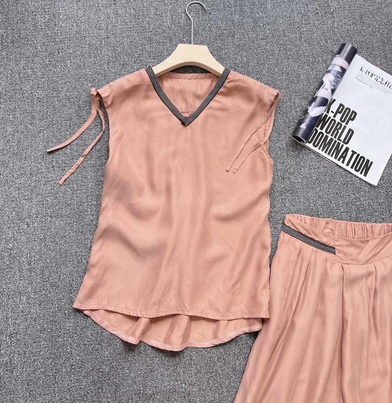 欧洲站2023新款休闲宽松铜氨丝上衣+阔腿裙裤两件套套装女