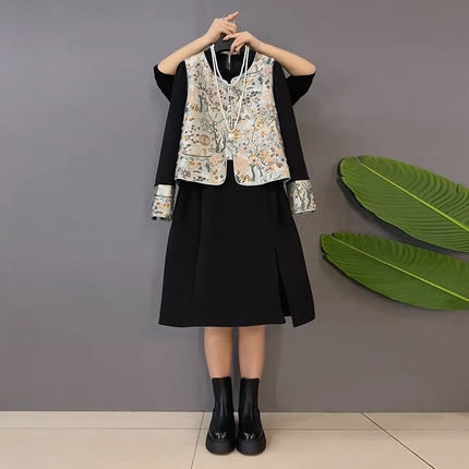 时尚复古打底裙国潮风高级感新中式马甲两件套胖妹妹新款大码套装