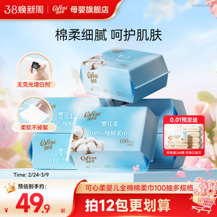 可心柔棉柔巾100%纯棉新生婴儿专用宝宝洗脸巾干湿两用一次性平纹