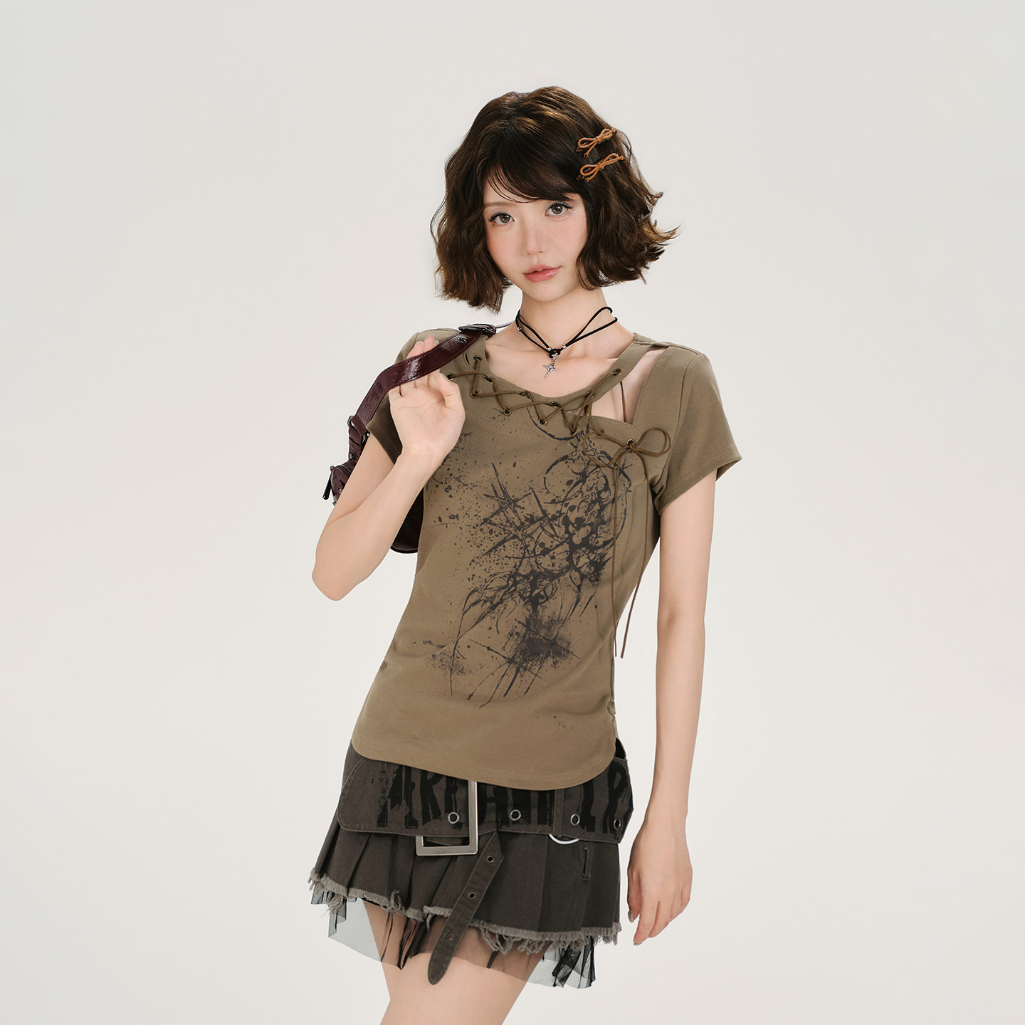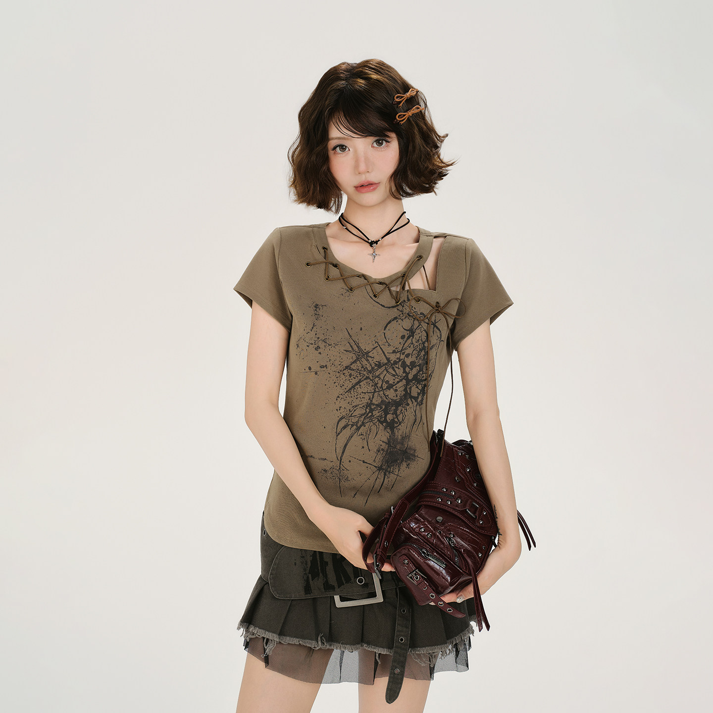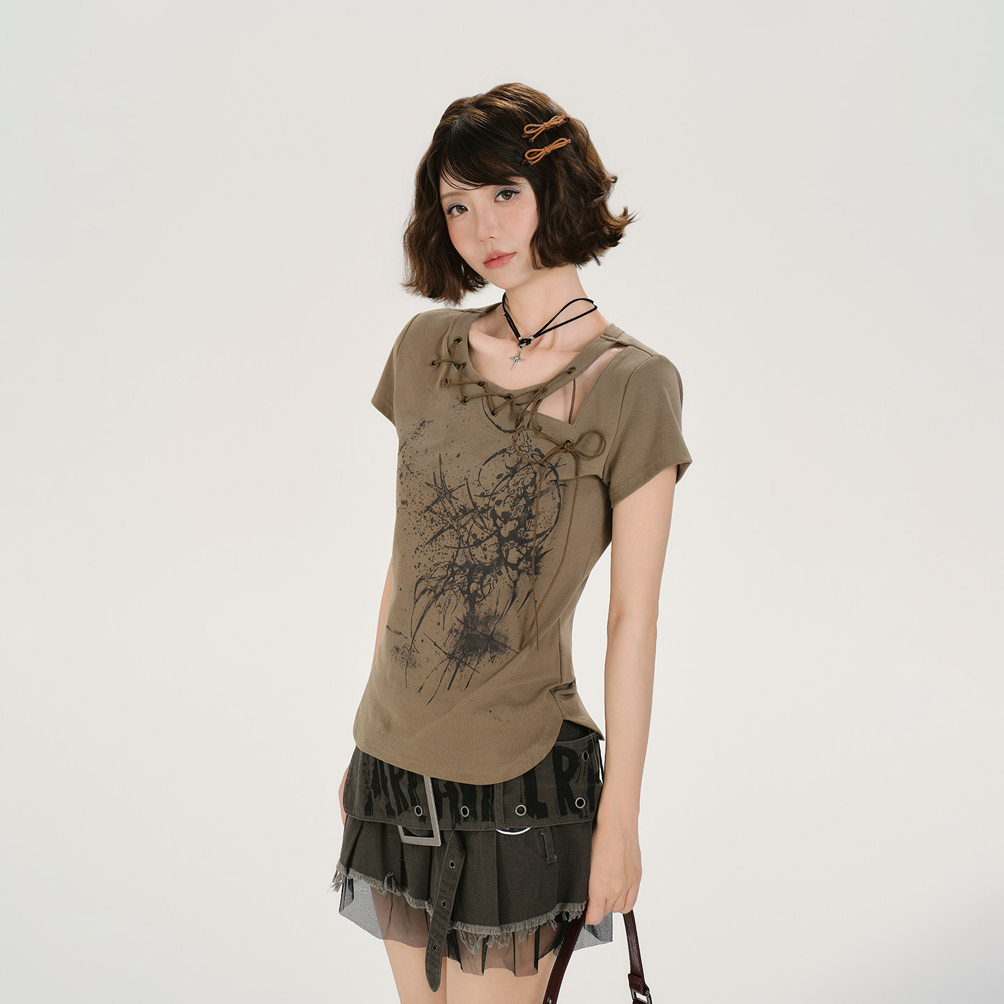 Girlyhalo美式复古辣妹绑带设计感短袖t恤女夏季新款圆弧修身上衣