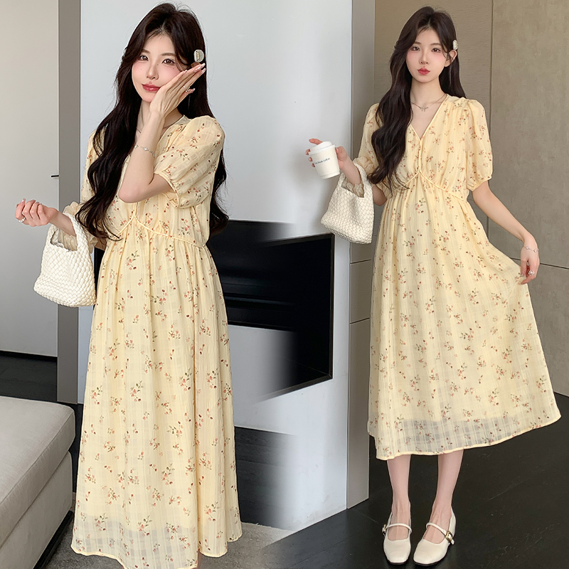 孕妇装夏装短袖V领碎花连衣裙夏