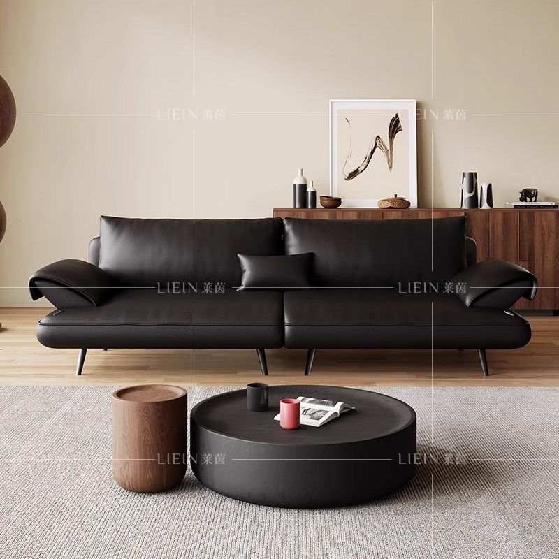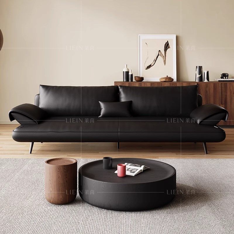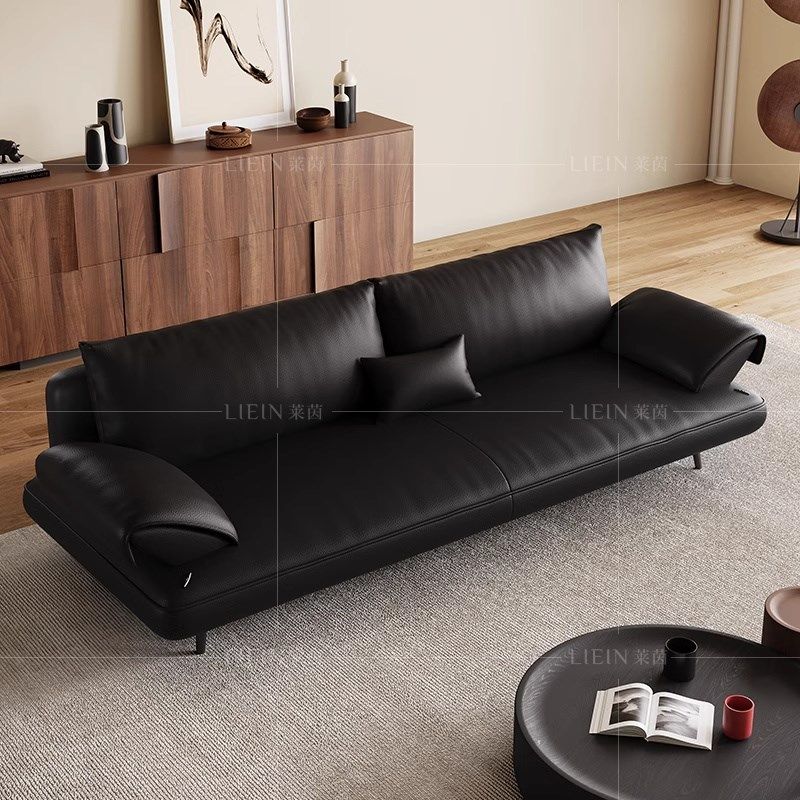 意式极简黑色头层真牛皮沙发客厅小户型直排现代帆船皮艺沙发新款