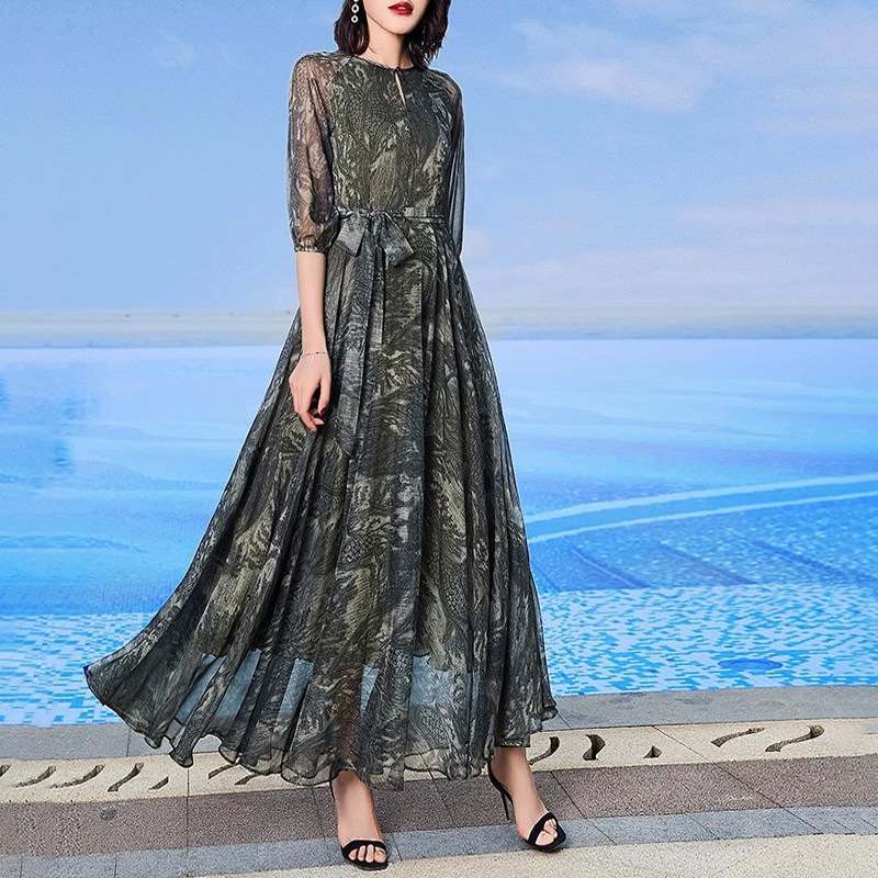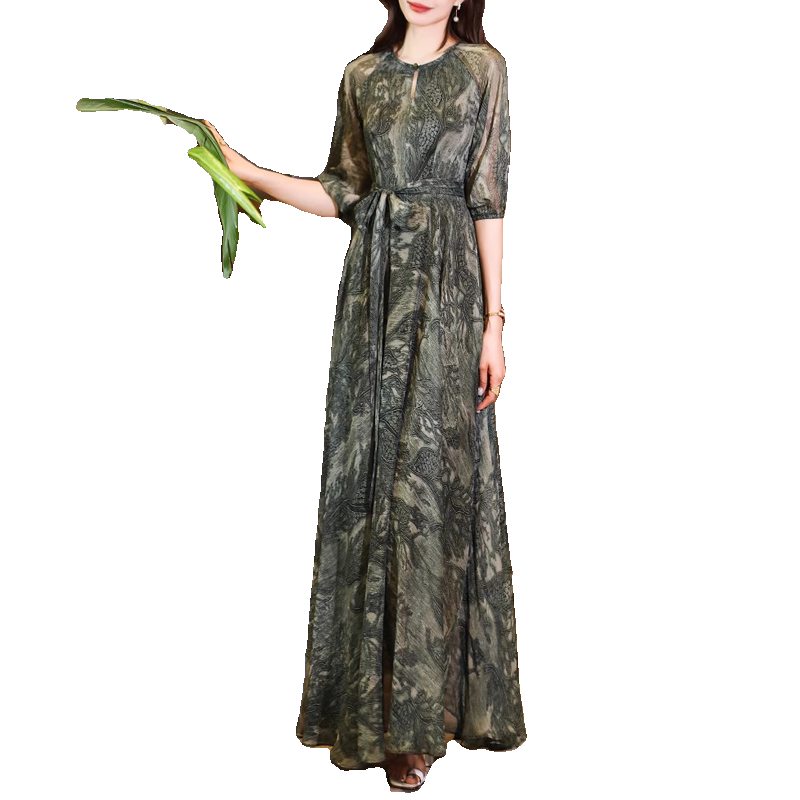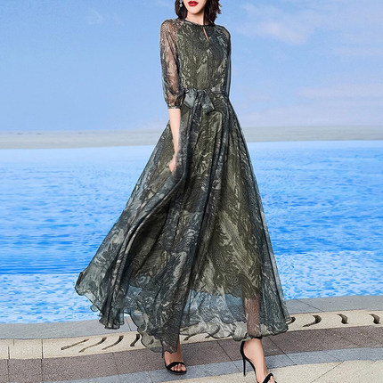 2025夏季新款高端时尚妈妈减龄真丝桑蚕丝连衣裙收腰沙滩度假长裙