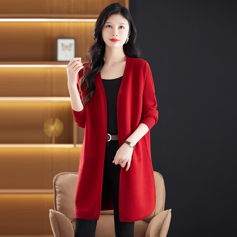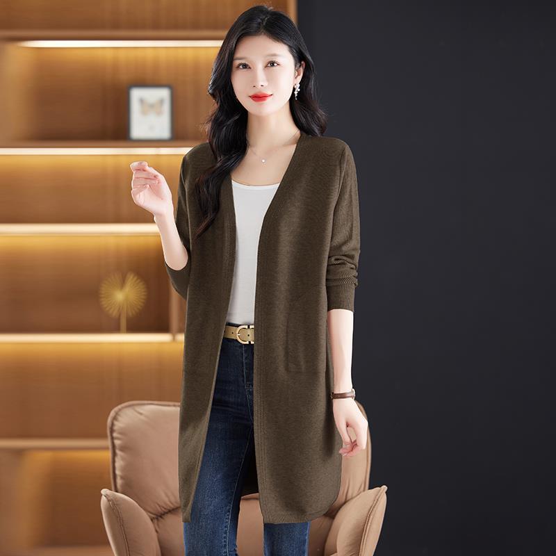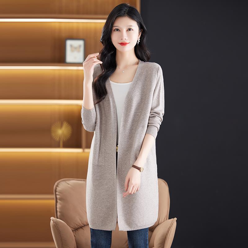 春秋薄款羊毛针织开衫女中长款毛衣外套宽松大码时尚妈妈外搭披肩