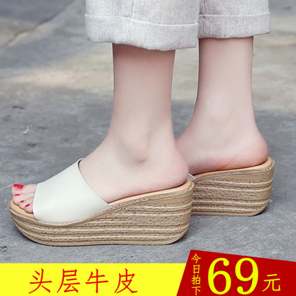 凉拖鞋女2025新款高跟厚底外穿时尚百搭真皮坡跟一字拖简约拖鞋夏