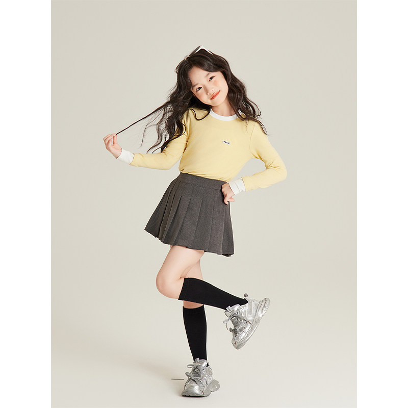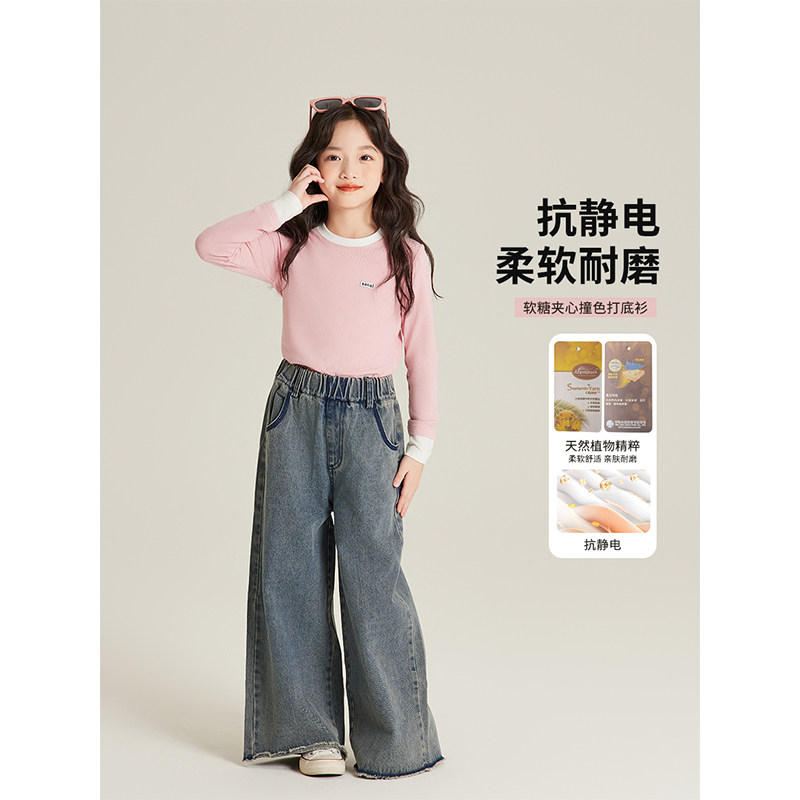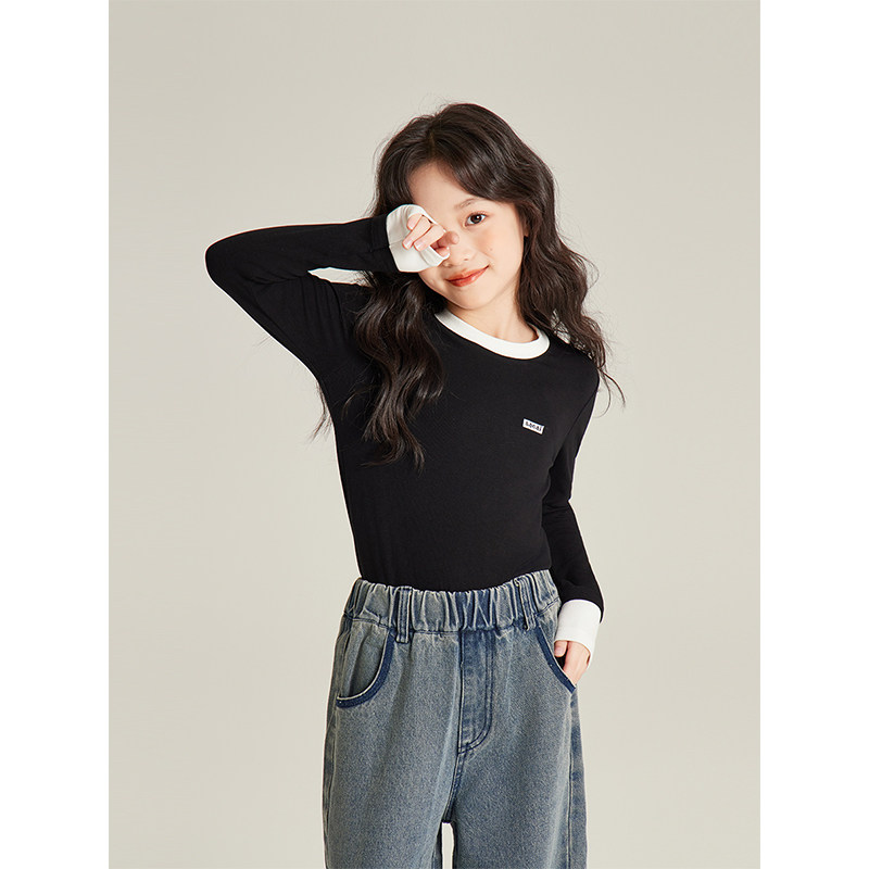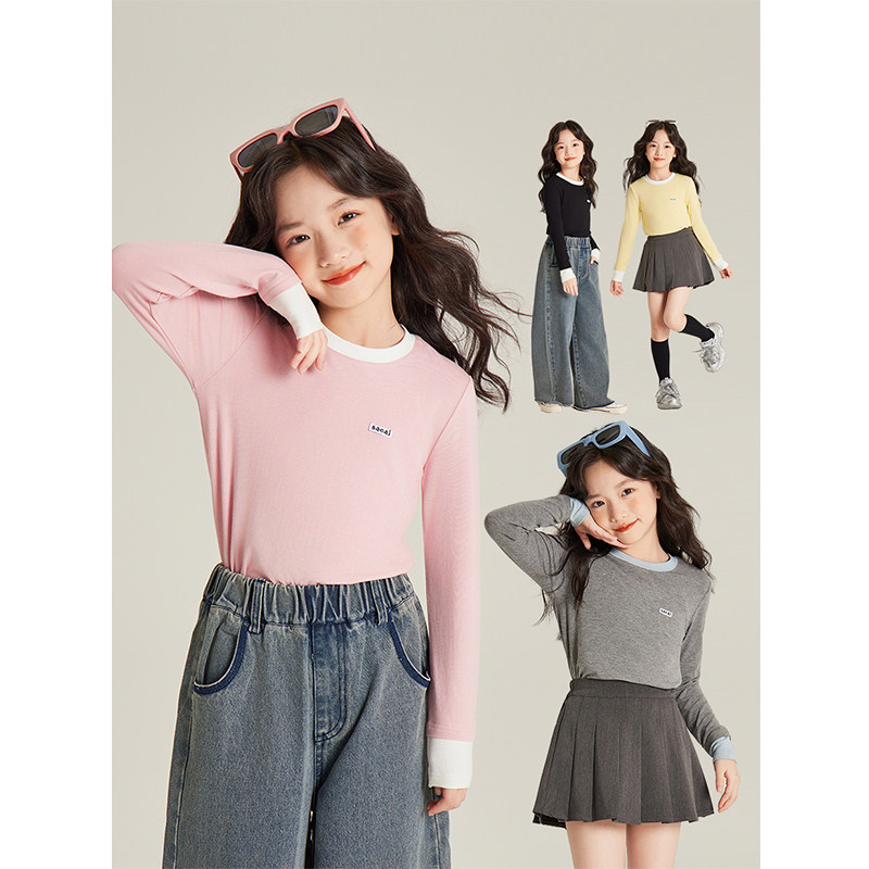 Amybaby女童上衣秋夏季2025新款纯色百搭休闲风拼接圆领长袖T恤