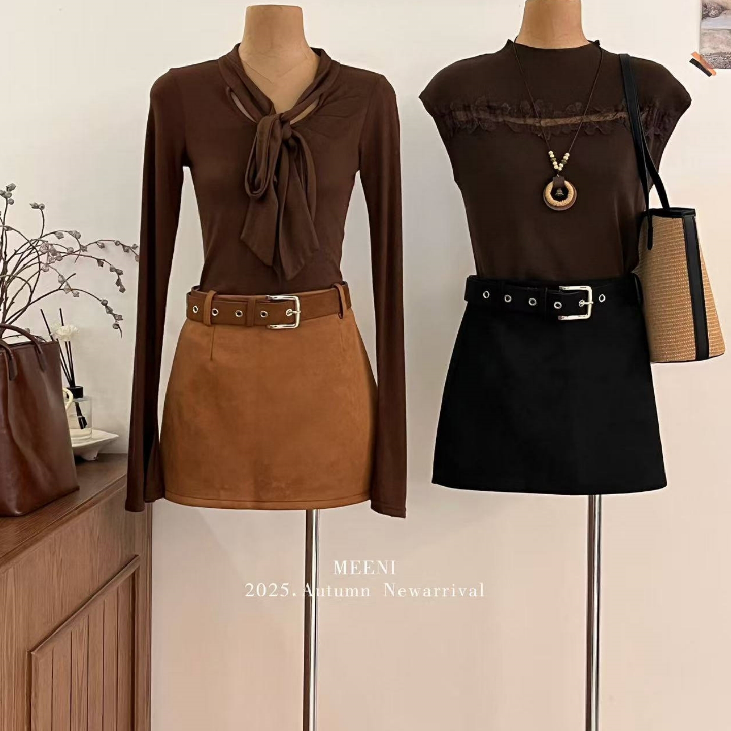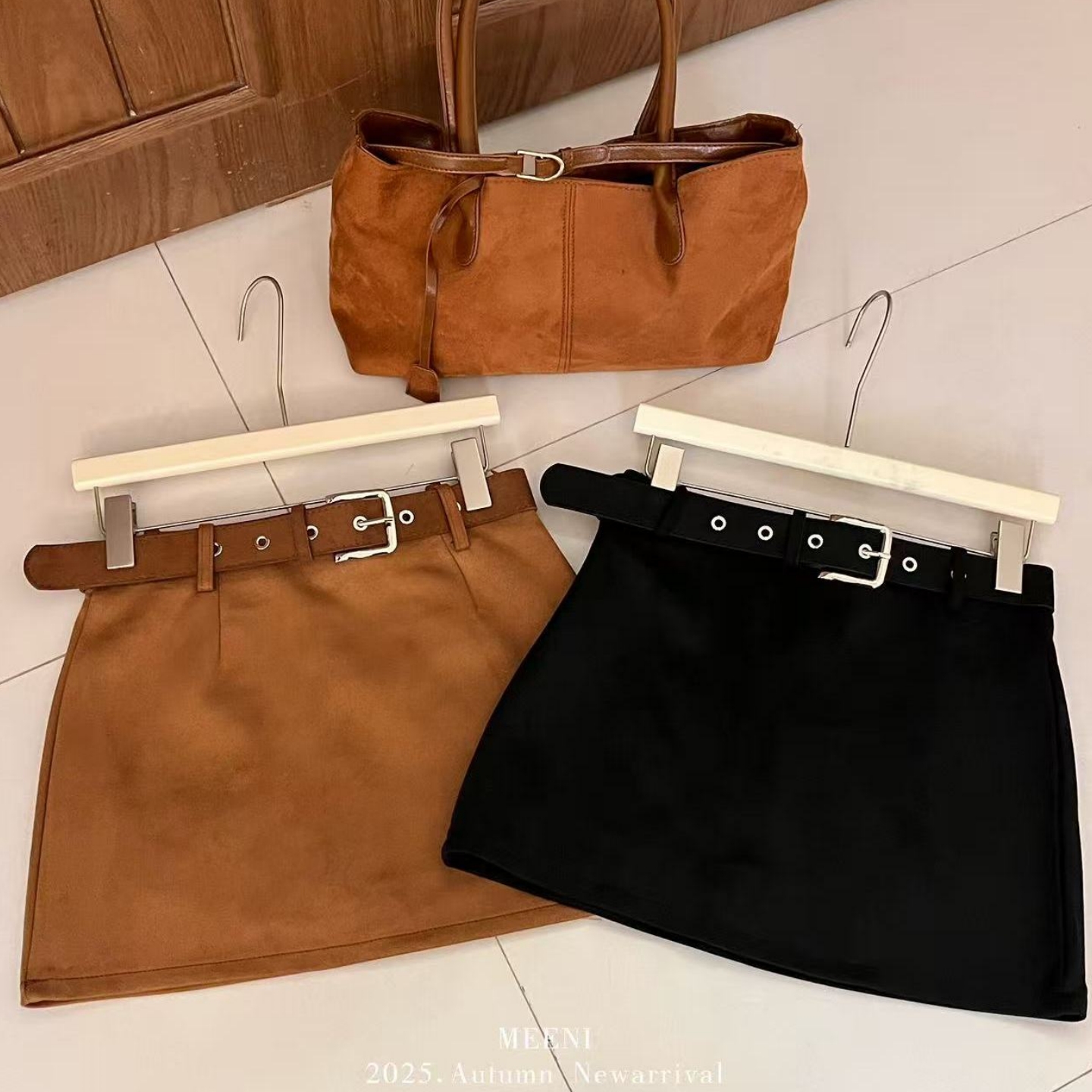 秋冬复古美式仿鹿皮绒高腰显瘦半身裙女防走光短裙包臀裙子配皮带
