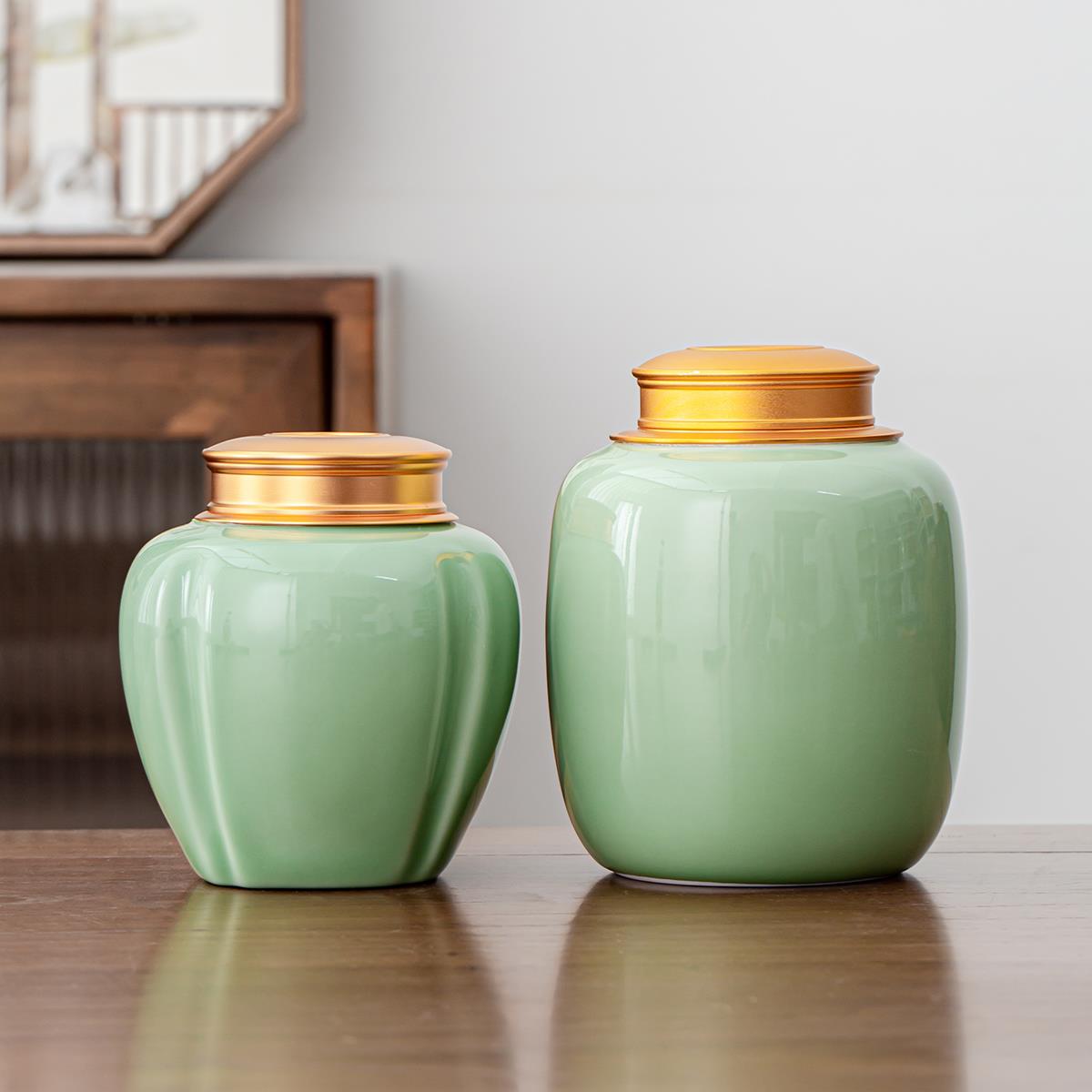 中式青瓷茶叶罐精品高档大号家用陶瓷储存罐防潮密封存茶罐高级感