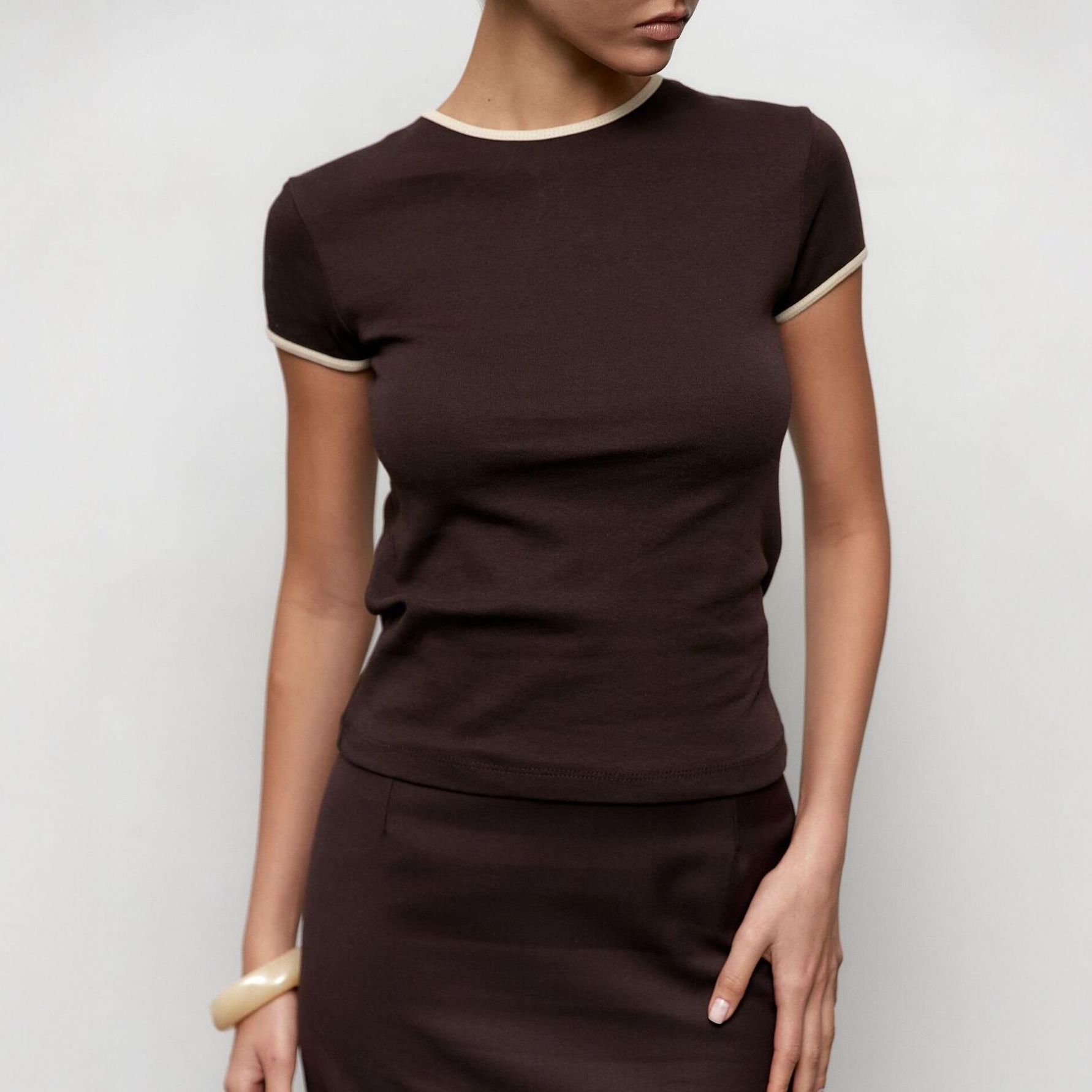 2025秋圆领撞色短款运动T恤女通勤百搭修身健身短袖上衣潮流设计