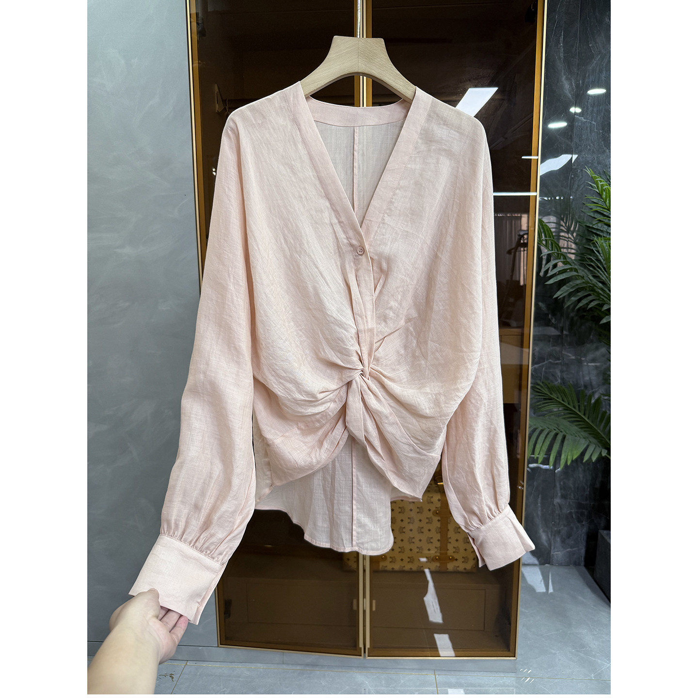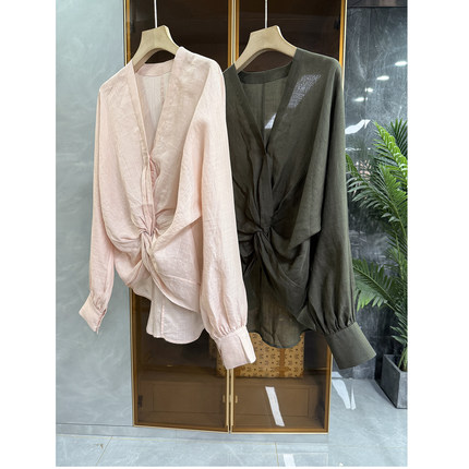 舒爽藏肉并存!宽松不规则扭花苎麻V领衬衫上衣女 20251223~ME