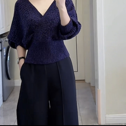 深灰色V领长袖针织衫女2025秋冬新款简约减龄上衣阔腿裤两件套装