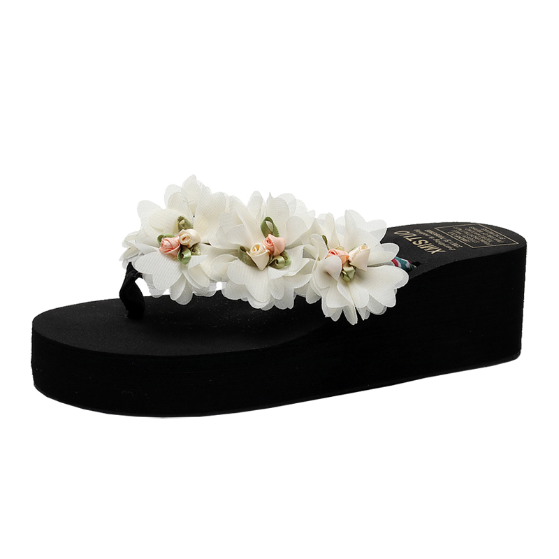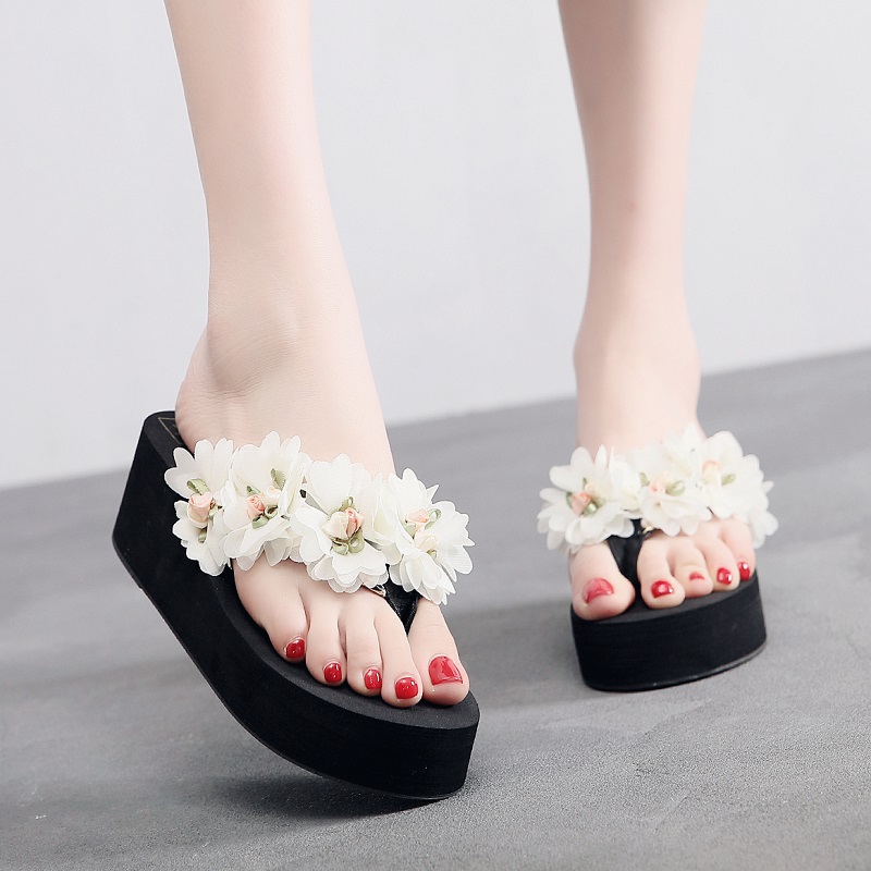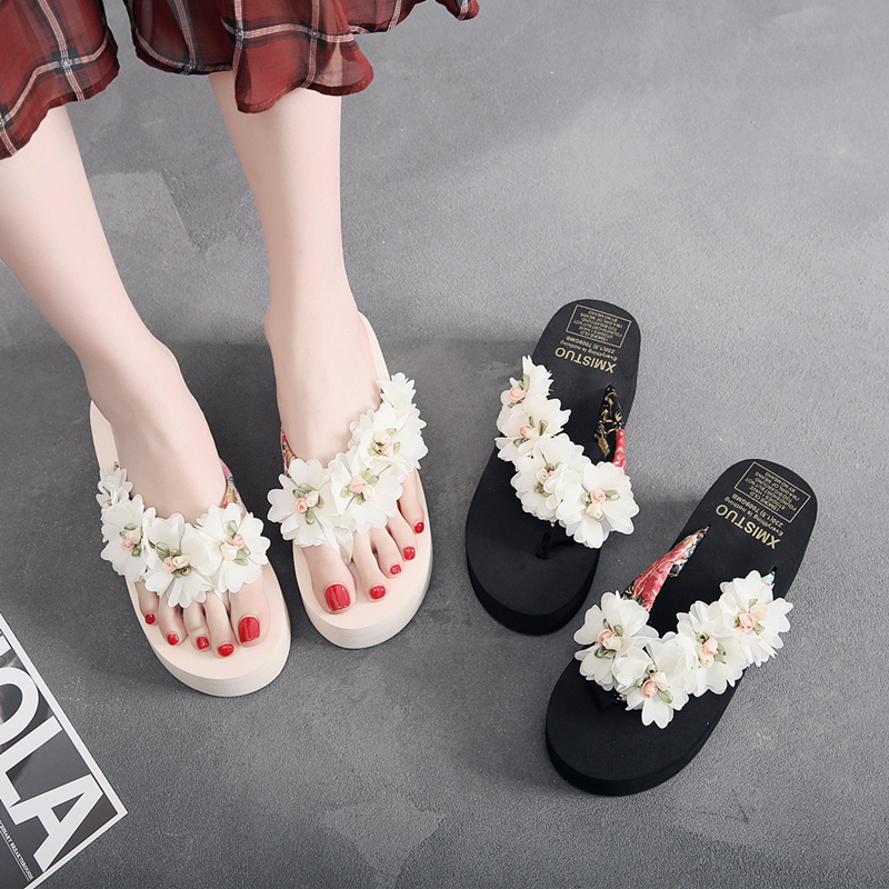 甜美花朵拖鞋女夏时尚百搭外穿厚底沙滩凉拖防滑外穿坡跟人字拖潮