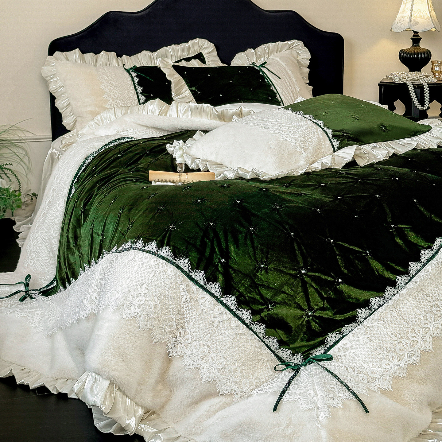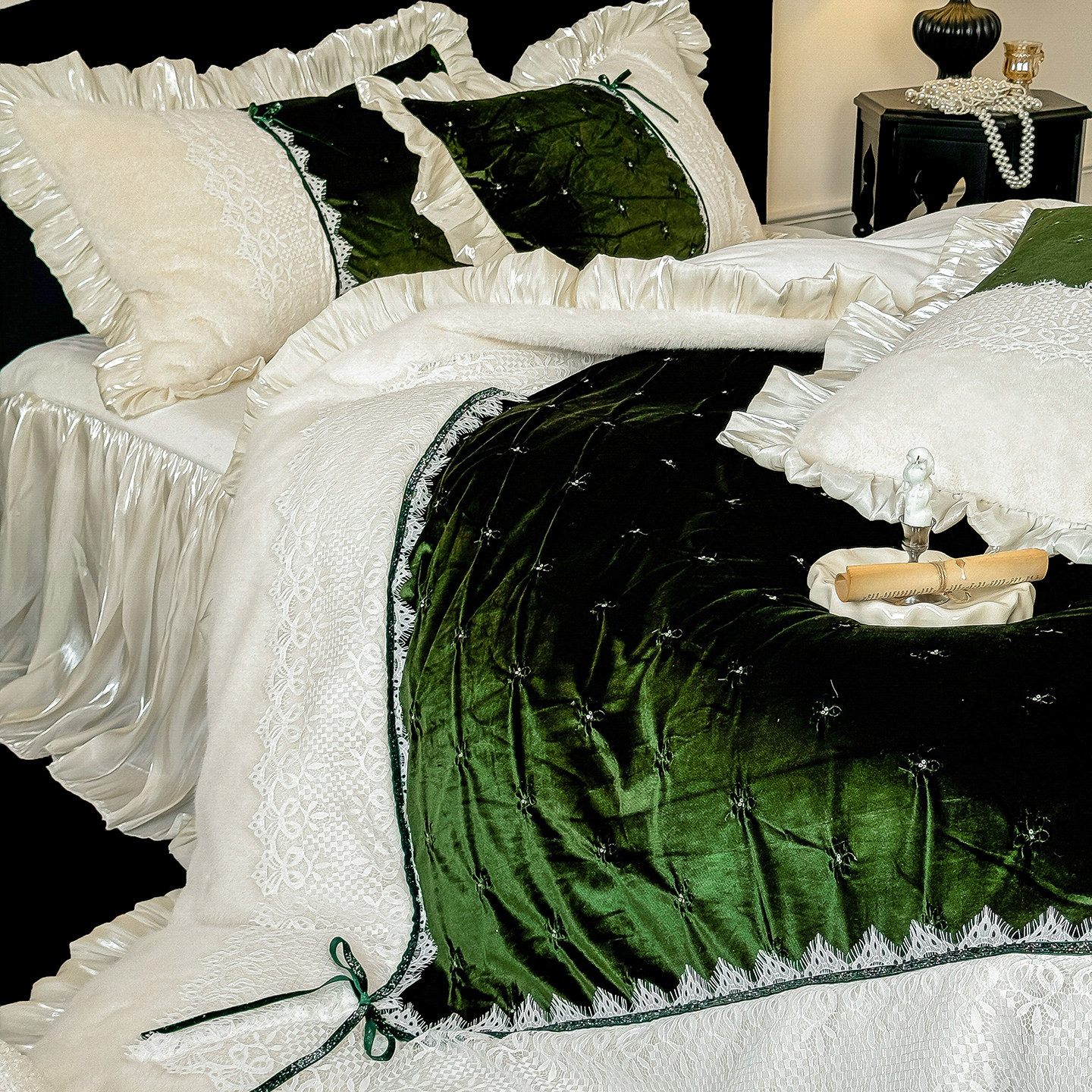法式复古金貂毛揪花四件套冬季牛奶绒蕾丝刺绣双面珊瑚绒被套床单