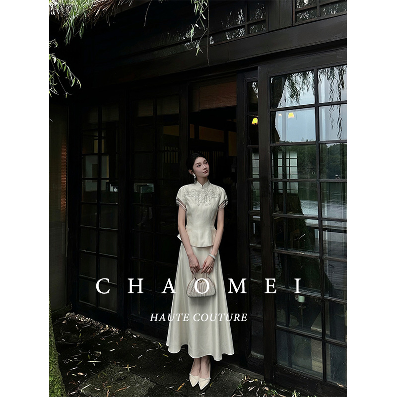 冯(CHAOMEI【熹礼2】新中式婚礼米色流苏刺绣收腰上衣半身裙套装