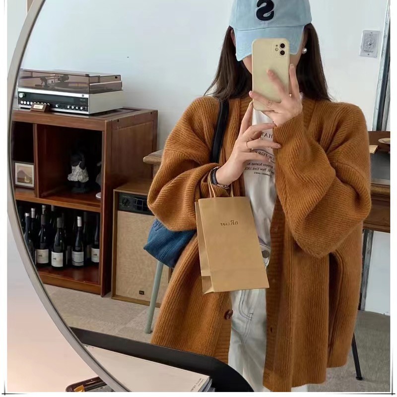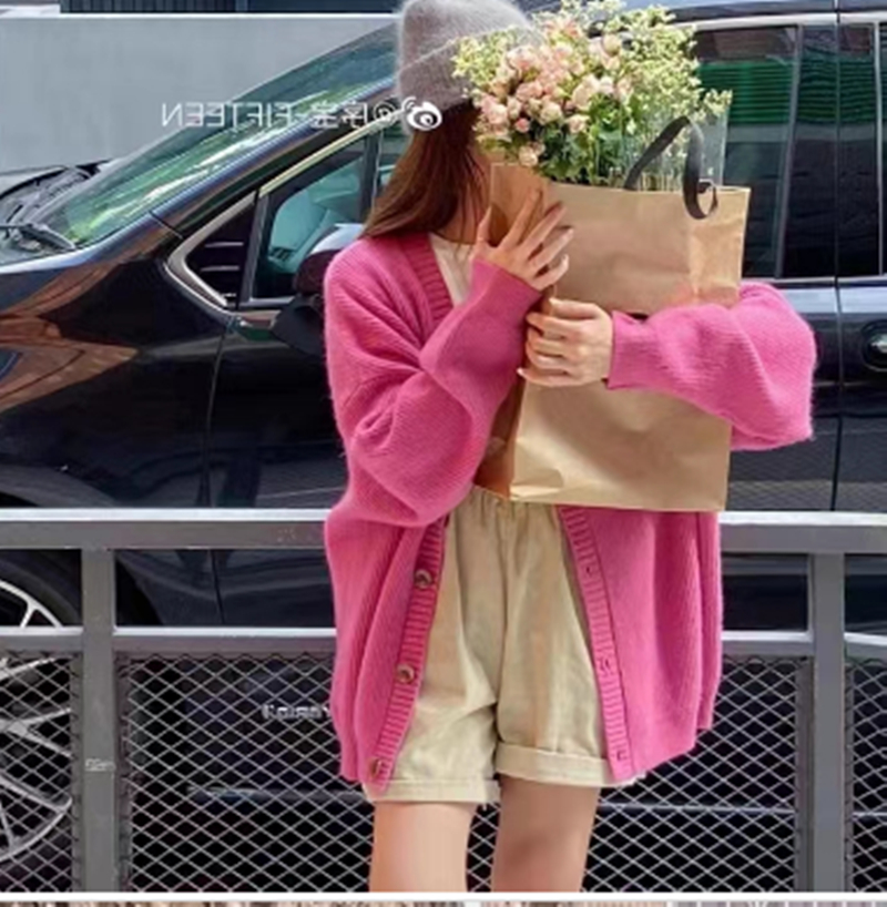 秋冬软糯坑条杏色针织开衫女外搭时尚洋气慵懒风v领毛衣外套纯色