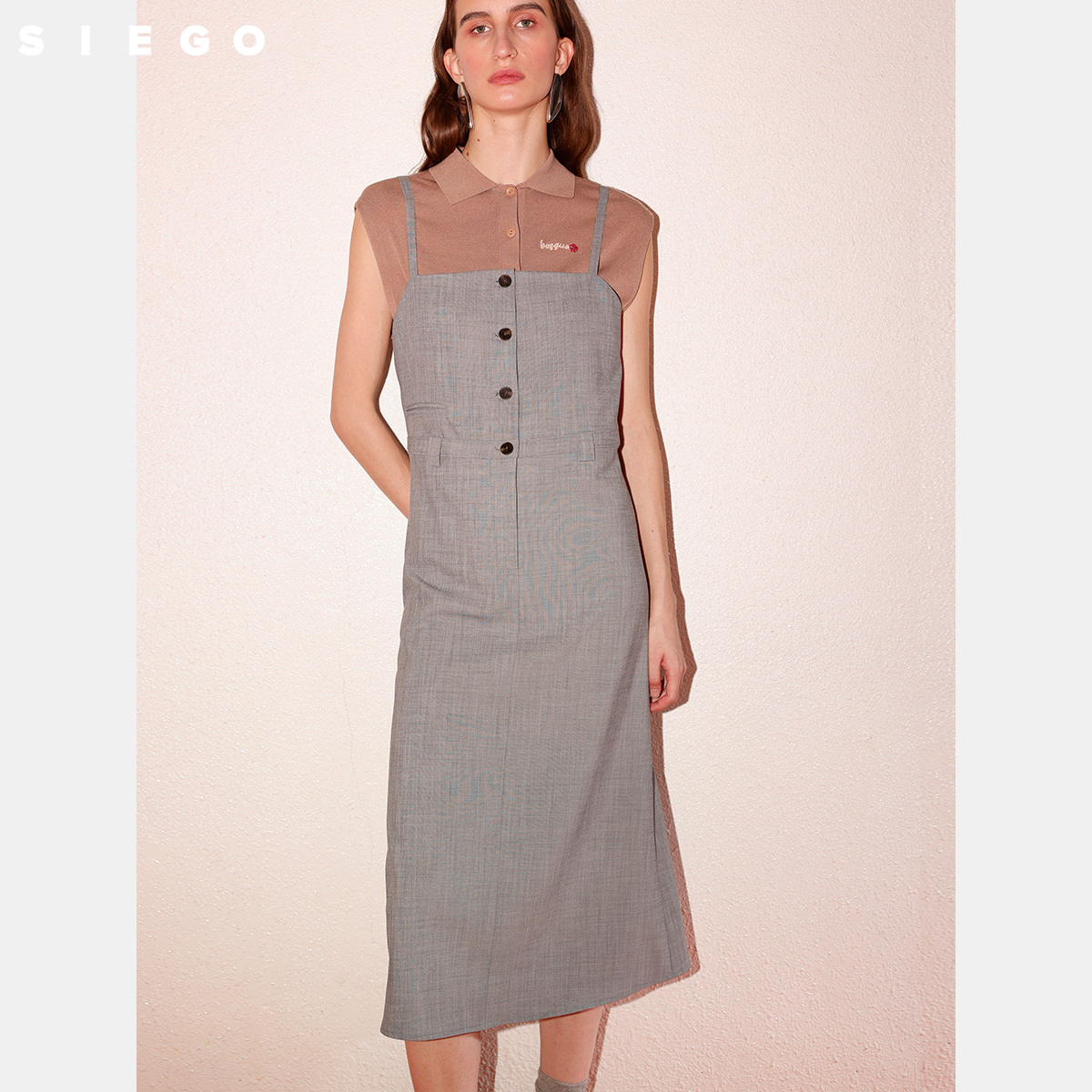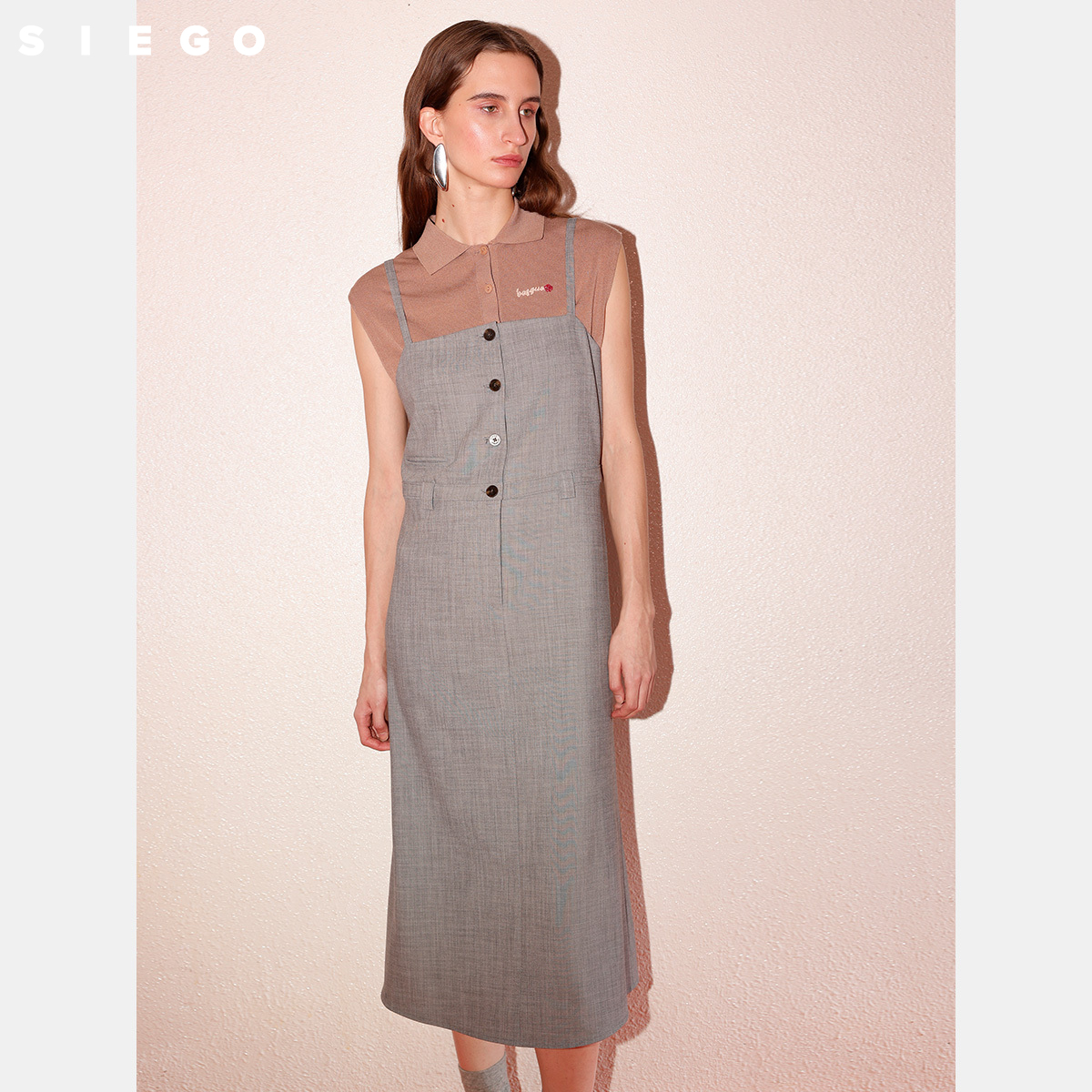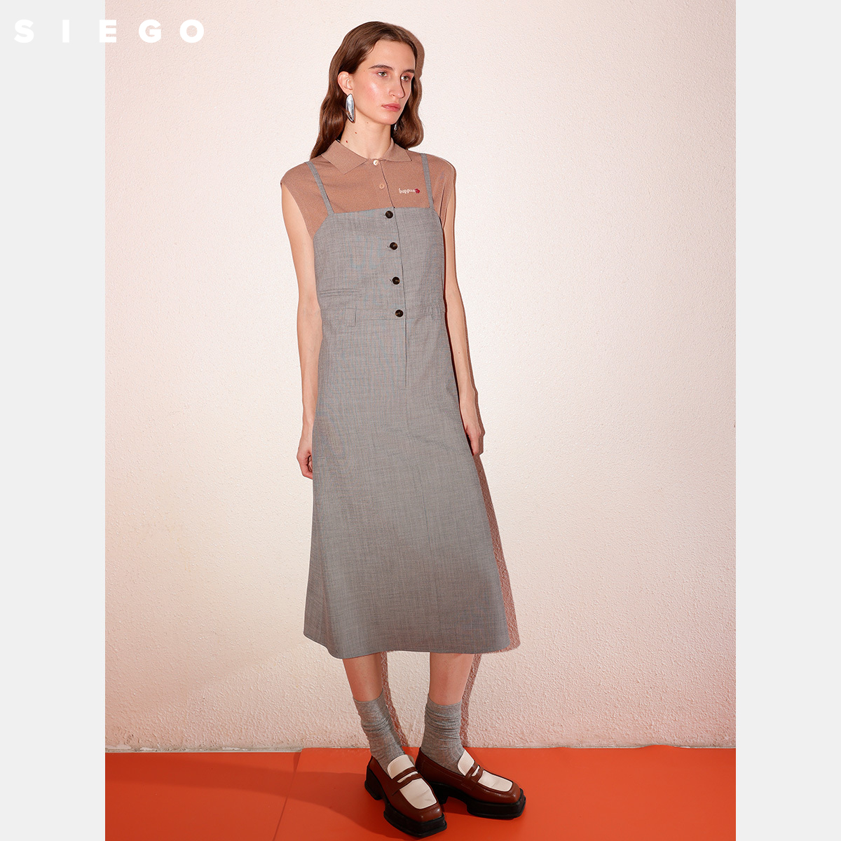Siego西蔻狮鹭灰学院风背带褶皱下摆连衣裙64533610