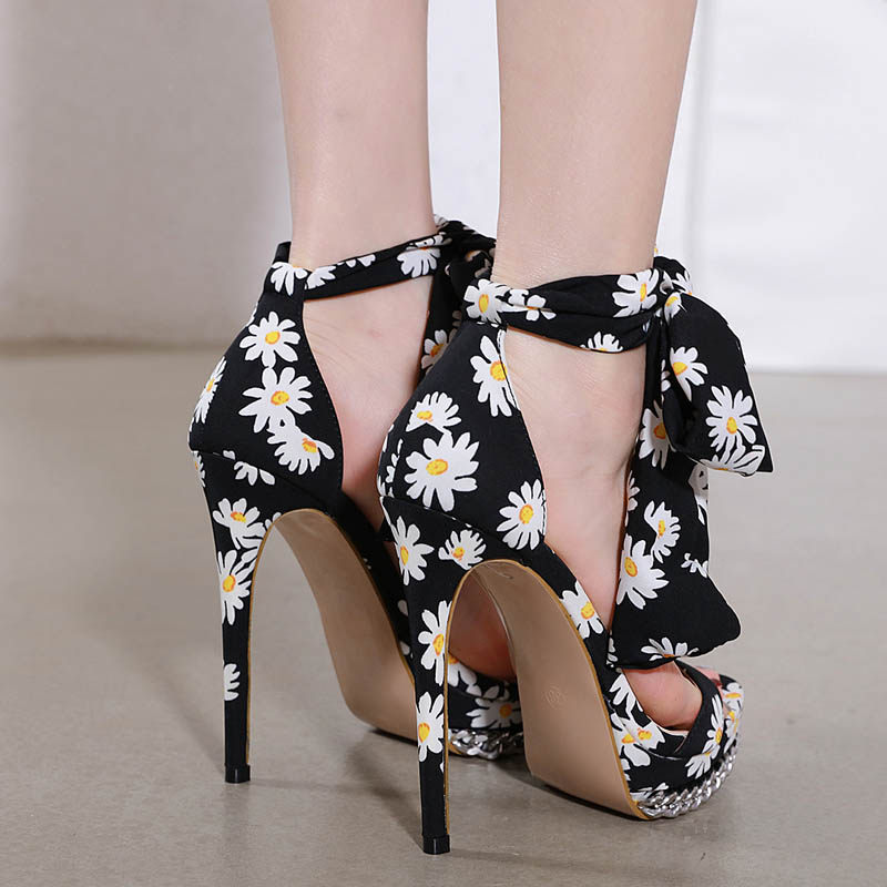 Women Sandals欧美流行小菊花金属链条装饰14CM超高跟大码凉鞋女