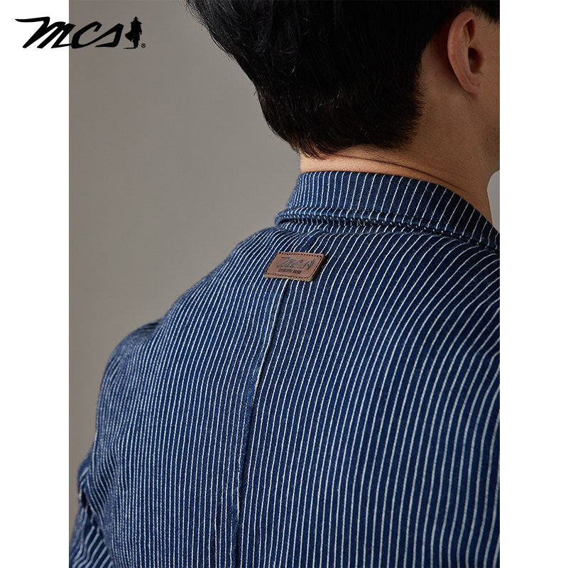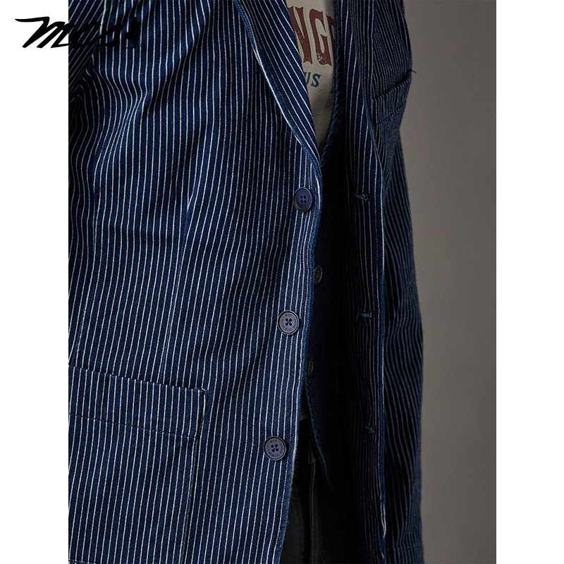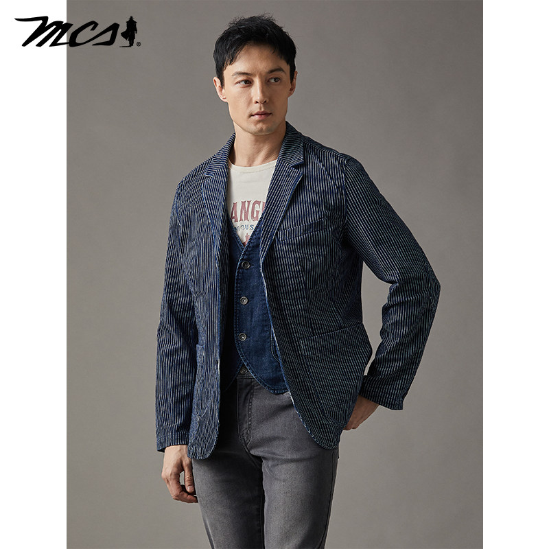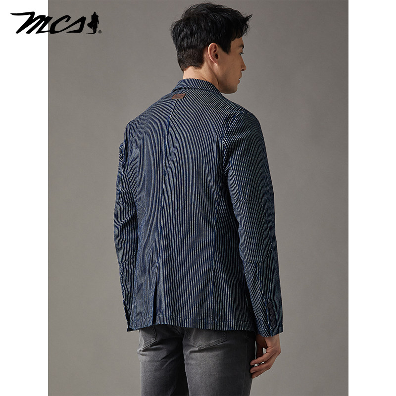MCS源自万宝路牛仔休闲西装春季新款修身水洗单排翻领条纹西服男