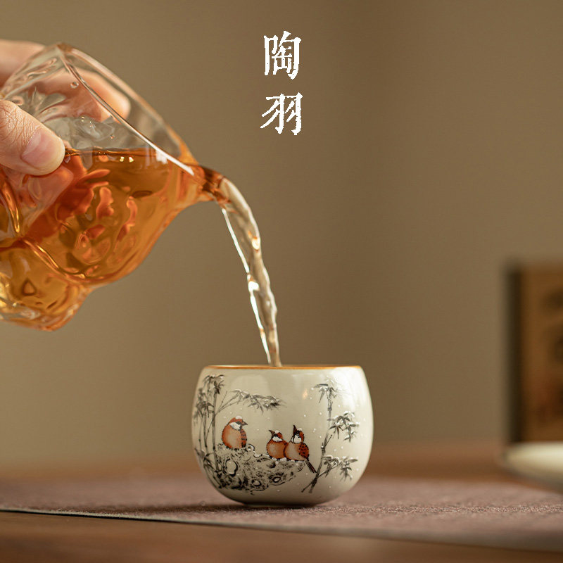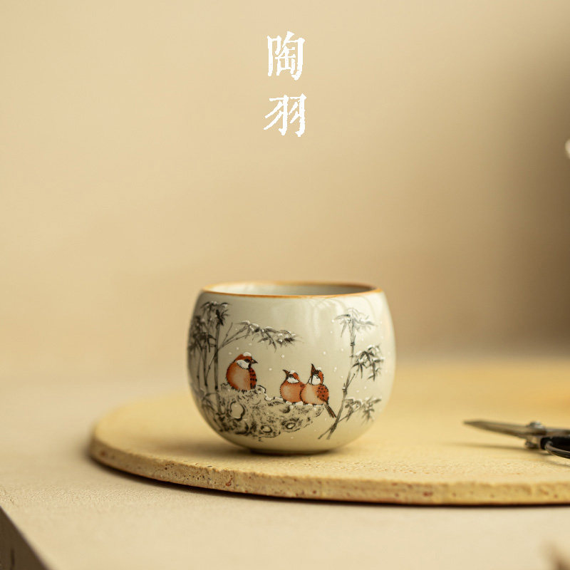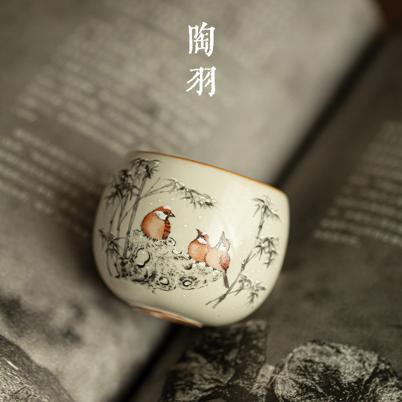 仿宋猪油白汝窑寒竹映雀罗汉杯家用陶瓷茶杯主人杯高颜值功夫茶具