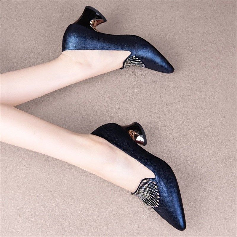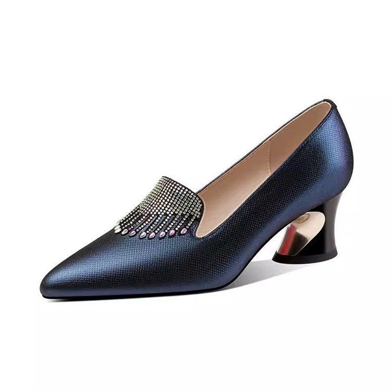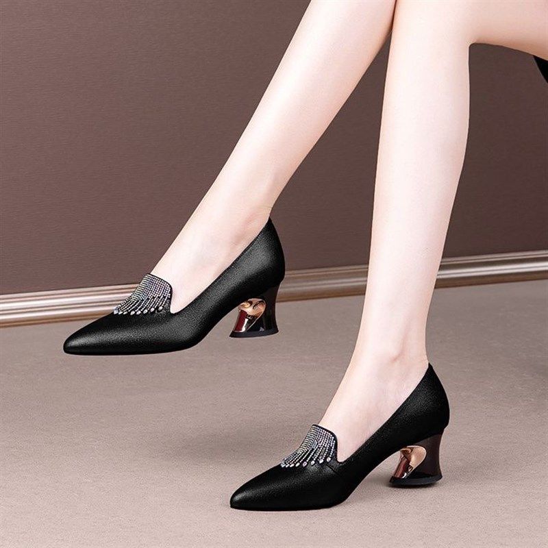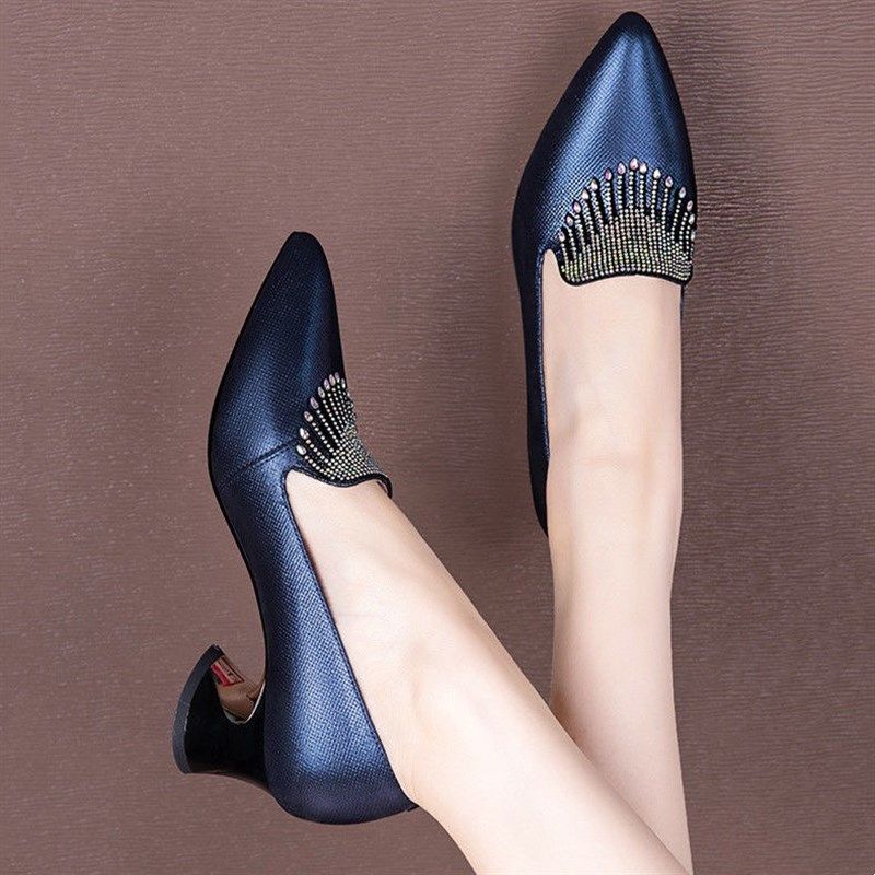水钻真皮尖头中口粗跟单鞋女中跟鞋2025春夏新款时尚百搭大码女鞋