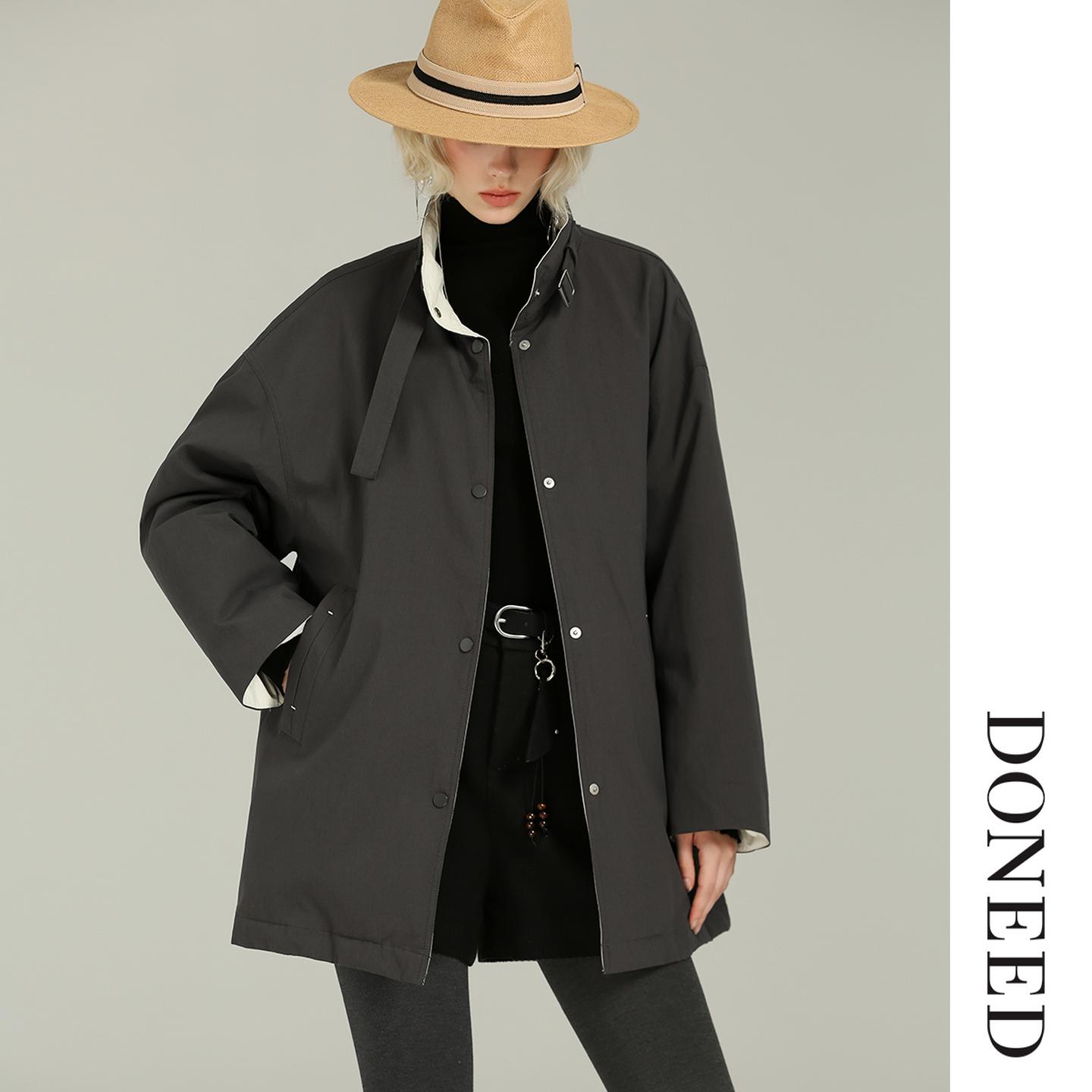 DONEED2025冬季新款慵懒风衣撞色立领宽松休闲中长款风衣外套女
