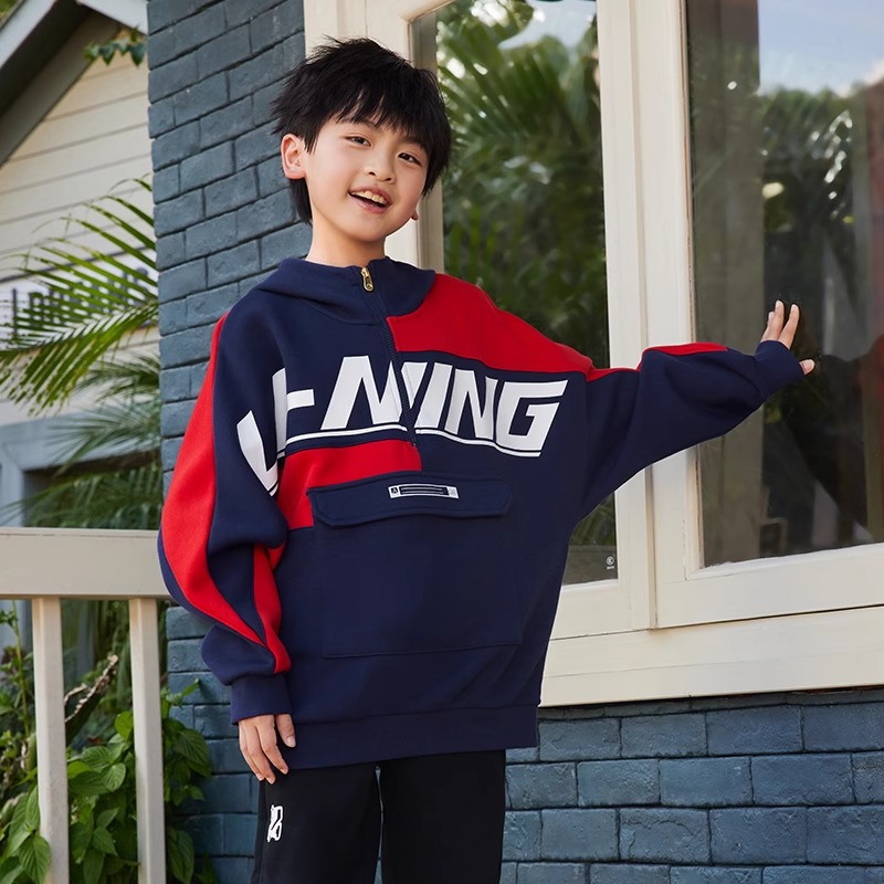 李宁儿童卫衣2025秋季男女大童潮流时尚宽松连帽卫衣撞色套头上衣