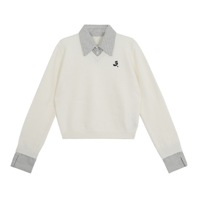 假两件格子拼接套头长袖毛衣女20