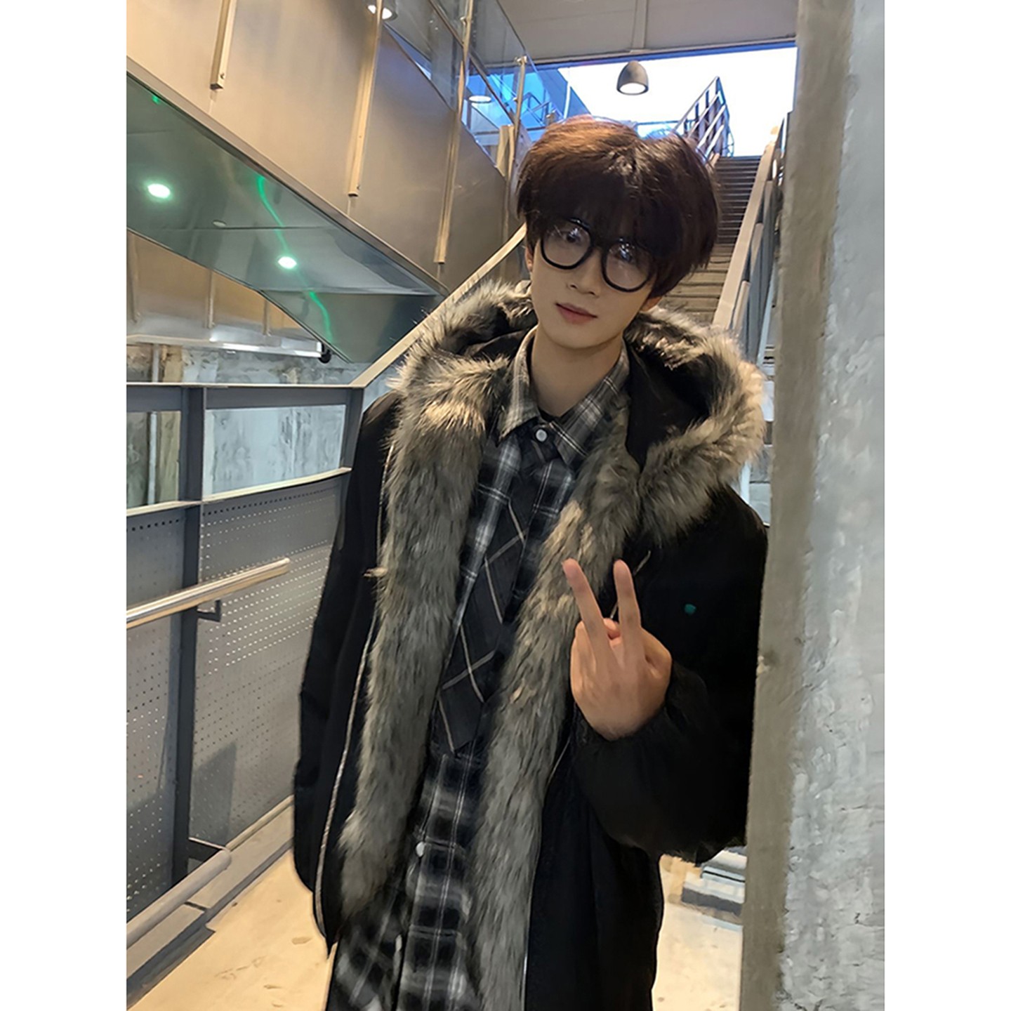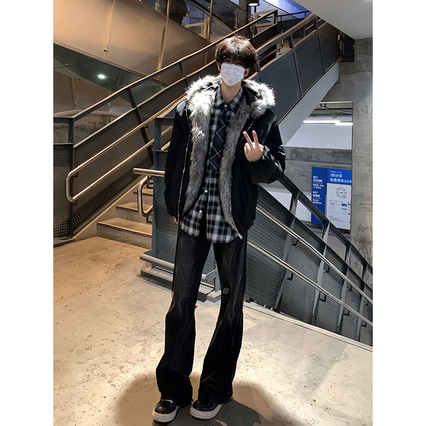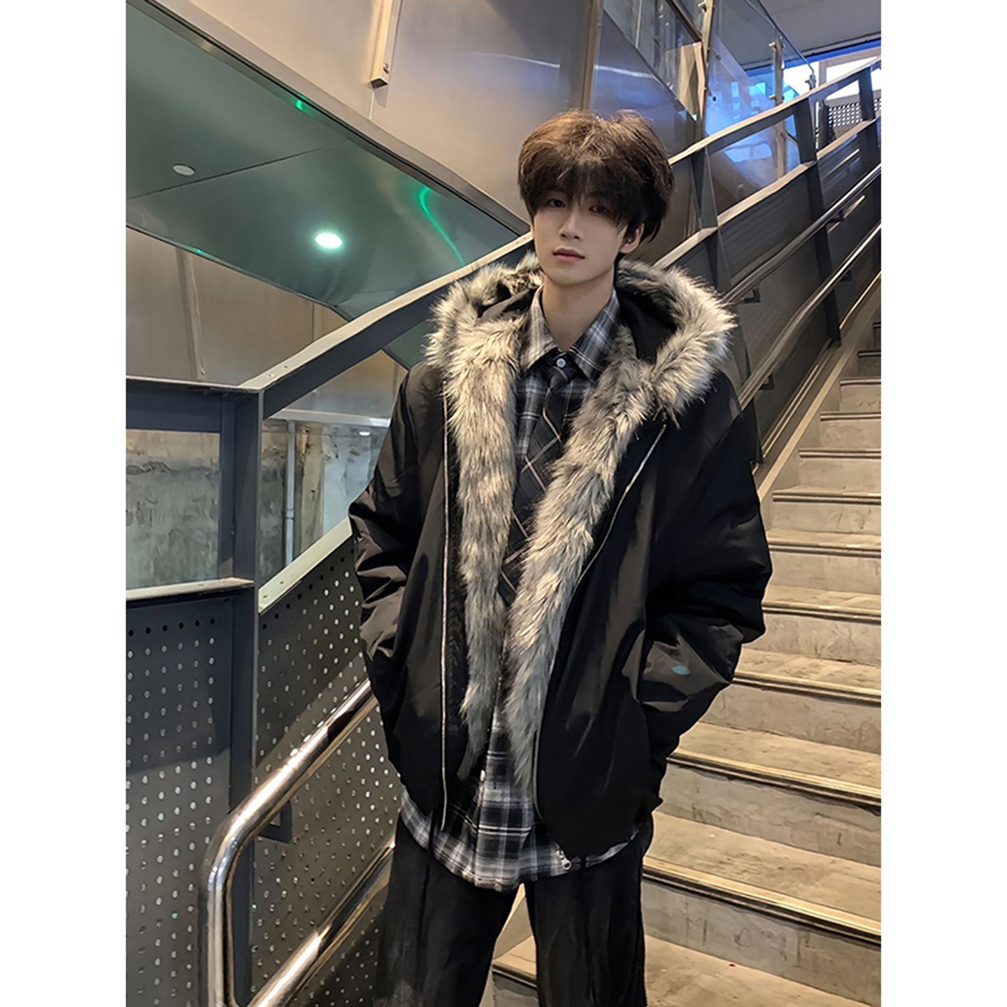 coolboybb座山雕毛领棉服男冬季加厚保暖短款外套黑色加绒棒球服