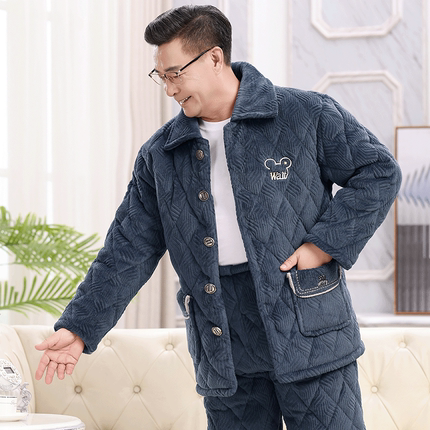 睡衣秋冬季三层加厚加绒珊瑚绒夹棉袄男士中老年父亲款家居服套装