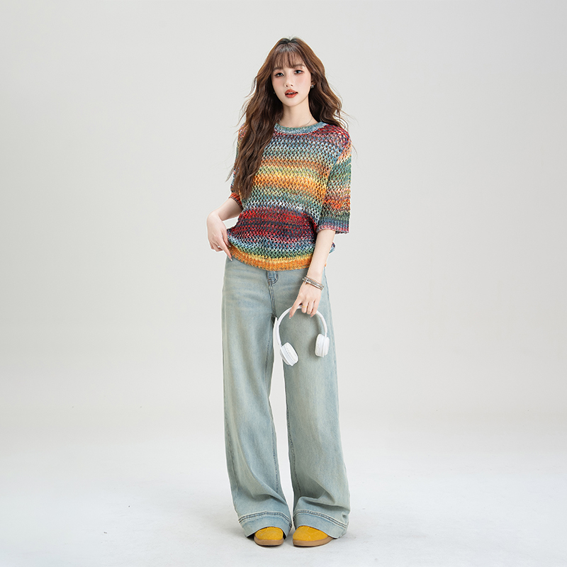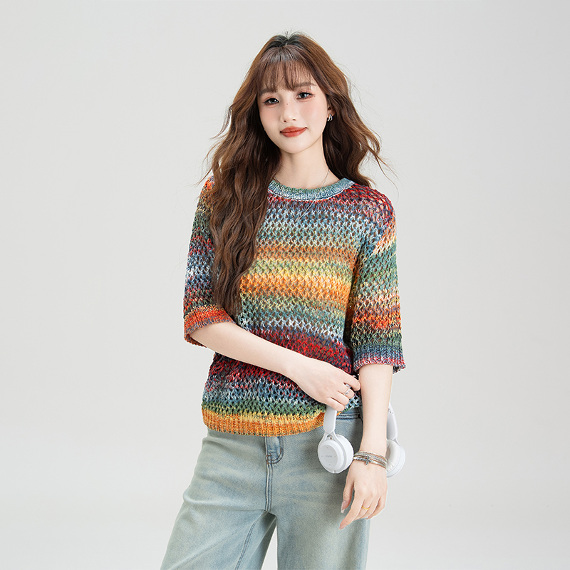 复古撞色条纹设计半袖防晒衣女2025夏季小众针织镂空宽松罩衫上衣