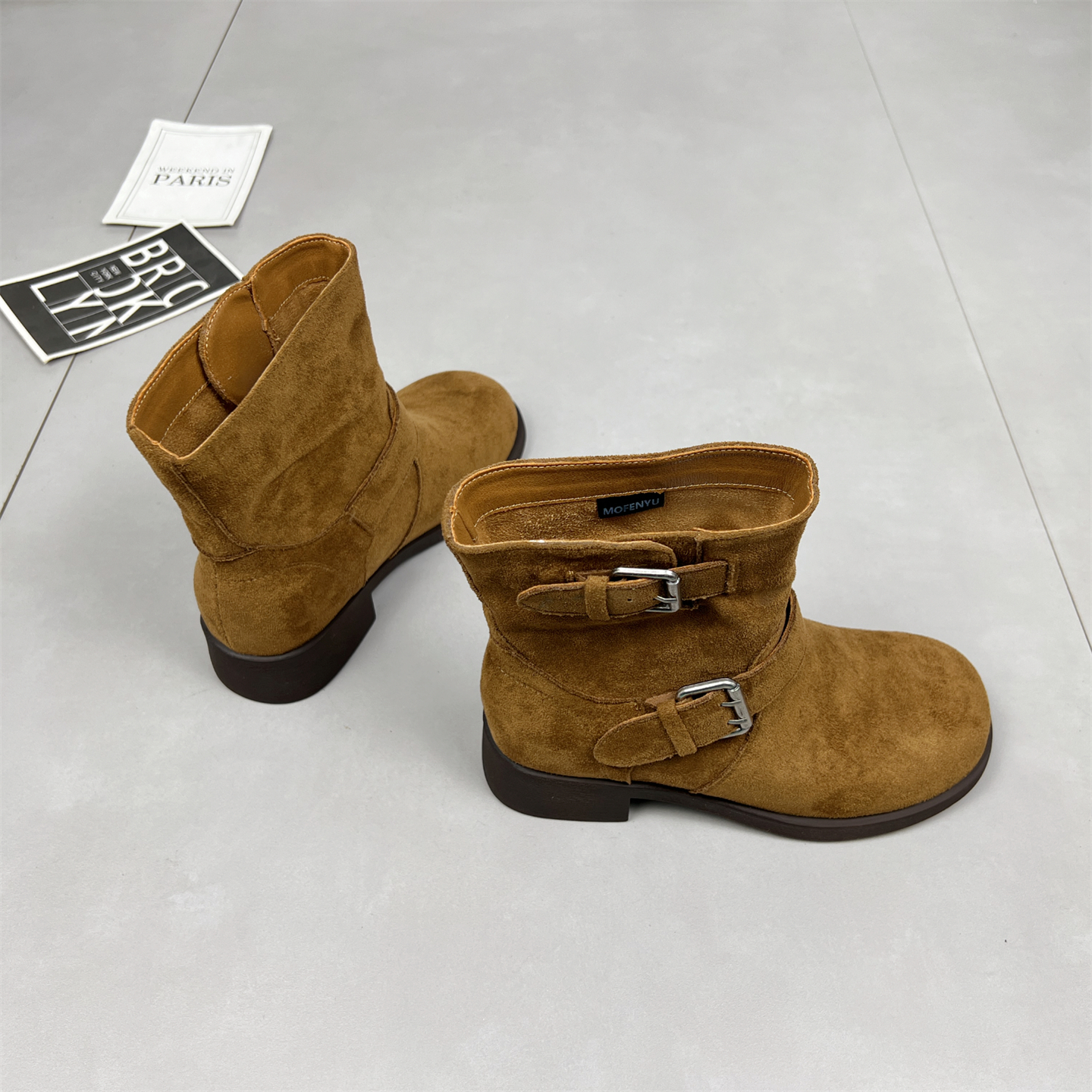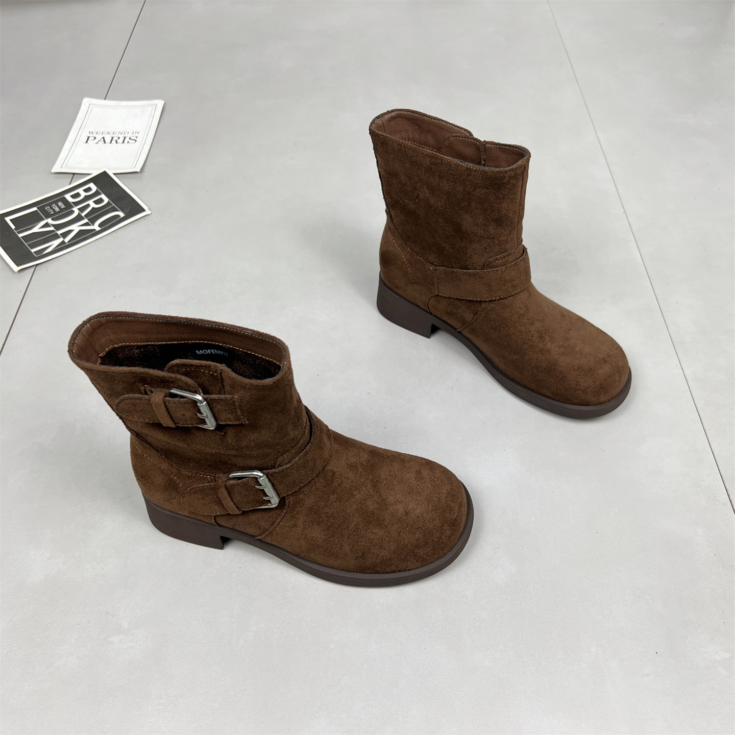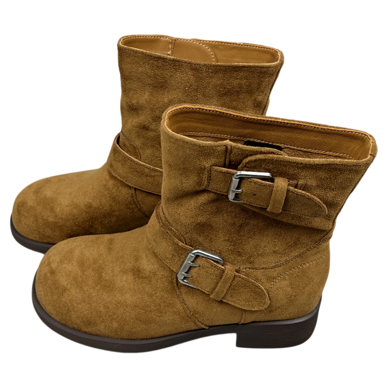 欧美皮带扣绒面短靴女2025秋冬粗跟圆头西部牛仔靴英伦马丁靴子潮